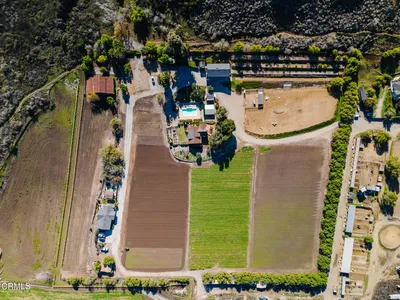 Extraordinary 10-Acre Gated Estate - Santa Rosa Valley HideawayWelcome to an unparalleled 10-acre private estate nestled in the heart of the pastoral Santa Rosa Valley, an exceptional 'hideaway' where natural beauty, privacy, and versatility converge. Tucked behind security gates and approached by a long, tree-lined driveway framed by majestic pepper trees, this rare offering borders the serene expanse of Wildwood Regional Park, delivering breathtaking views and ultimate tranquility.The property features three distinct structures, creating endless possibilities for multi-generational living, income potential, or a fully self-sustaining lifestyle:The main residence, beautifully remodeled, offers approximately 5-7 bedrooms and 3 bathrooms, showcasing an open-concept design, wide-plank flooring, and seamless indoor-outdoor living. Expansive windows and doors frame picturesque views, while the resort-style pool and spa create a luxurious retreat ideal for relaxation and entertaining.A newer secondary home on the eastern portion of the property features 3 bedrooms, 2 bathrooms, and a 2-car garage, providing a perfect guest residence, extended family quarters, or private office retreat.The recently constructed Agricultural Building is a standout feature--offering four large garage bays, two bathrooms, and a beautifully finished, condo-style living space, ideal for a variety of uses including workshop, studio, or additional living quarters.For equestrian and agricultural enthusiasts, the property is fully equipped with a large historic reinforced barn with concrete foundation, multiple outbuildings including hen houses and a goat house, and an expansive approximately 1/2-acre fenced grass dog agility field.Infrastructure is exceptional with a private well, two 5,000-gallon water storage tanks, 600-amp electrical service, three septic systems, three propane tanks, and two fire hydrants, ensuring both functionality and preparedness. The gently rolling acreage offers abundant space for farming, orchards, vineyards, or recreational use, all while enjoying the peaceful rural setting just approximately one hour from West Los Angeles.This is more than a property--it's a lifestyle. A rare opportunity to live, create, and thrive in one of Ventura County's most coveted and picturesque communities. Note: the square footage quoted is an ESTIMATE by estimating sq.ft of main residence & estimating sq ft of newer building.