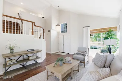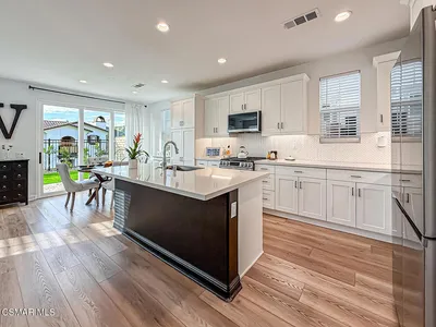 Nestled in the highly sought-after Mission Oaks neighborhood of Camarillo, this beautifully maintained two-story residence offers exceptional curb appeal and a warm, inviting presence from the moment you arrive. Thoughtfully designed, the home features a desirable floor plan with 4 bedrooms and 3.5 bathrooms, including a convenient downstairs bedroom with its own private bath--ideal for guests, multigenerational living, or a private home office. The entry opens to a large, light-filled living room that flows effortlessly into the dining area, creating an elegant space for gatherings and everyday living. The heart of the home is the spacious family room, complete with a cozy fireplace and seamless access to the kitchen. The kitchen itself is generously sized and well-appointed, offering stainless steel appliances, ample cabinetry, and plenty of counter space for cooking and entertaining. A downstairs laundry area and powder bathroom add to the home's functionality and comfort. This home also features distressed wood flooring, crown molding, and large baseboards that elevate the home style with a refined yet welcoming feel. Upstairs, the expansive primary suite serves as a peaceful retreat. The remodeled primary bathroom features modern finishes, dual vanities, and a huge walk-in closet designed for exceptional storage and organization. Two additional upstairs bedrooms include brand-new carpet, and all bathrooms throughout the home have been tastefully updated, ensuring a cohesive and contemporary aesthetic. The serene backyard oasis has meticulously landscaped grounds to create a sense of privacy and tranquility. A new covered patio and inviting sitting area provide the perfect setting for outdoor dining, relaxation, or simply enjoying the stunning views that make this property truly special. Whether hosting friends or savoring quiet moments, the outdoor space is designed to be enjoyed year-round. Located within close proximity to all three highly regarded local schools--Tierra Linda Elementary, Las Colinas Middle School, and Adolfo Camarillo High School--this home offers not only comfort and beauty but also convenience and community. With its thoughtful upgrades, versatile layout, and picturesque surroundings, this Mission Oaks gem is ready to welcome its next chapter.