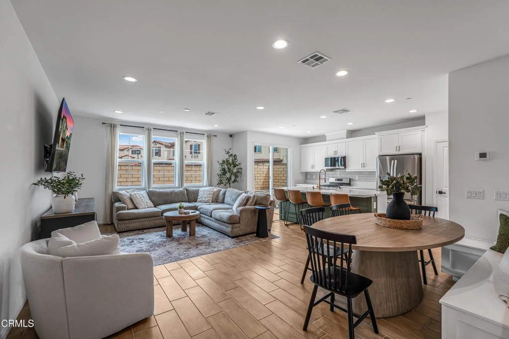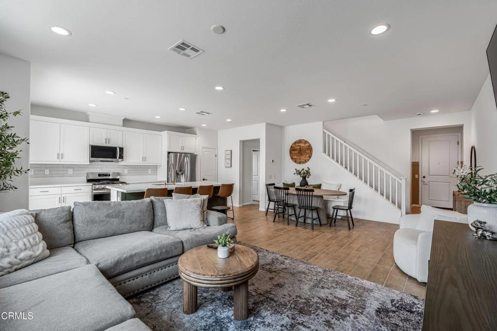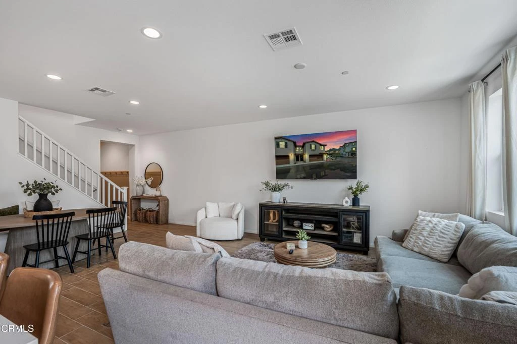 Welcome to this beautifully upgraded four bedroom, two and a half bath home offering approximately 1,725 square feet of thoughtfully designed living space in the sought-after Anacapa Canyon community of Camarillo. This desirable end unit features extra windows that fill the home with natural light and showcase the area's pleasant coastal climate.This community has monthly CAM (Community Association Management) fees similar to HOA dues. The property is a leasehold estate on state land, and owner occupancy as a primary residence is required. CAM fees cover maintenance of common areas and shared amenities, with the current fee at $442/month. No resale price restrictions.The main living area centers around a stylish upgraded kitchen featuring custom countertops and backsplash, a large island with shiplap accents, deep recessed sink, stainless steel appliances, and bar seating. Tile flooring spans the main level, complemented by built-in bench seating with hidden storage. A pantry and additional storage closet add convenience, while the open layout seamlessly connects the kitchen, dining, and living areas, ideal for entertaining.Upstairs, the primary suite offers a spacious walk-in closet and an upgraded ensuite bathroom with dual vanities, custom tile, and a walk-in shower with built-in bench. Scenic mountain views enhance the space. Additional bedrooms and an upstairs laundry area complete the second level.Outdoor living includes a built-in fire pit and seating area, perfect for relaxing or hosting. Additional features include central air conditioning, a direct access two car garage with finished flooring, built-in bar with storage, tankless water heater, and whole-house water softener. Black and gold hardware throughout and an upgraded entryway with beadboard wainscoting add a modern touch.Residents enjoy resort-style amenities including a park, dog park, clubhouse with kitchen, billiards and shuffleboard, pool, children's pool, two spas, fitness center with yoga studio, BBQ areas, and scenic walking trails.