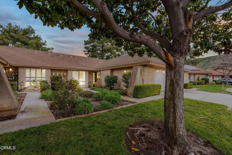 Welcome to this charming 2 bedroom, 2 full bath home located in Leisure Village in Camarillo, a highly desirable 55+ guard gated community known for its secure, low maintenance, and active lifestyle. It offers 1,070 square feet of living space on a 2,178 square foot lot. A beautifully maintained front yard creates wonderful curb appeal. Upon entry, you're greeted by a warm and inviting living room with plush carpeted floors and a sliding glass door leading to the backyard. Adjacent to the living room is a lovely dining area, perfect for gatherings, followed by a classic white kitchen featuring ample white cabinetry, white appliances, elegant quartz countertops, a double sink, and space for a breakfast table. The kitchen also provides direct access to the attached one car garage, which contains the laundry area. Near the front entry are the two bedrooms, including a spacious secondary bedroom with a generous closet and a full hallway bath. The primary suite offers its own private bathroom with a marble sink, a bathtub and shower, and a large mirrored closet. The backyard is ideal for entertaining, featuring a covered patio area for family gatherings and additional green space to enjoy outdoor living.