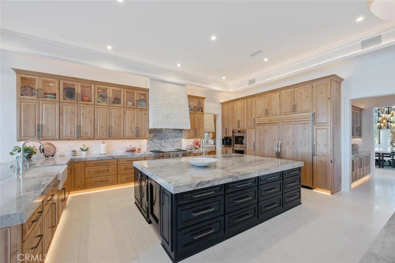 Completed in 2025, this single-story architectural residence is set on approximately one acre of gated grounds, blending panoramic views with refined design and resort-caliber living. A dramatic foyer introduces Turkish white limestone floors, hand-applied Venetian plaster walls, and a sculptural multi-tier chandelier. Beyond, the great room soars to 26-foot ceilings with a limestone fireplace and expansive 20-foot disappearing nano doors that dissolve the boundary between interior and exterior living. The turret-style living room is framed by 12-foot windows and anchored by a striking quartzite fireplace, while the formal dining room features custom built-ins and designer lighting. The chef’s kitchen impresses with 15’6” ceilings, custom knotty alder cabinetry, dual navy-stained islands, quartzite countertops, premium appliances, and an adjoining circular breakfast nook. A fully equipped prep kitchen, Butler’s Pantry, and concealed walk-in pantry ensure effortless entertaining. The wine room is a statement piece, clad in backlit gemstone slabs with custom alder racking and a 70-bottle refrigerator. A 50-foot gallery hallway leads to a show-stopping powder room and into thoughtfully designed private spaces, including a tiered theater with 140-inch screen and full bar, and a sophisticated study with quartzite fireplace and French doors opening to a secluded patio. Three secondary bedroom suites feature bespoke finishes and private baths, with one currently styled as a gym overlooking pool and mountain views. The primary suite is a retreat of its own, complete with fireplace, nano doors to the yard, dual custom walk-in closets, and a spa-inspired bath offering a sculptural soaking tub, quartzite vanities, and an oversized backlit quartzite steam shower. Outside, the gated motor court with permeable pavers leads to an oversized three-car garage. The resort-style grounds showcase a covered patio with wood-paneled ceiling, stone fireplace, and outdoor kitchen. The beach-entry pool features a 10-foot spa, waterfall, fire bowls, and tranquil fountain, complimented by designer pavers. A detached casita offers complete privacy with limestone floors, a full kitchen, bedroom suite, designer bath, and covered patio with quartzite bar. An extraordinary estate blending architectural presence, refined craftsmanship, and resort-caliber amenities.