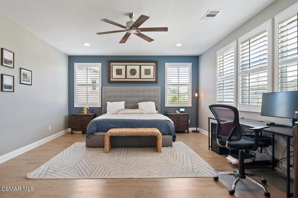 Discover this stunning 6-bedroom, 4-bath home in Camarillo's sought-after Village at the Park! The open layout centers around a chef's dream kitchen equipped with a Monogram 6-burner range and griddle, triple ovens, Bosch dishwasher, decorative backsplash, granite countertops, an oversized island perfect for gatherings, and abundant cabinetry. Enjoy formal living and dining rooms, plus two downstairs bedrooms ideal for guests and/or a home office. Upstairs offers a spacious loft, laundry room, 3 additional bedrooms, one of them with an en-suite, and a luxurious primary suite with dual walk-in closets and an upgraded bath. Stylish high-quality laminate flooring flows throughout. Enjoy a lush backyard with above-ground spa, large side yard, and charming courtyard complete with kid's play set. Community perks include two sparkling pools, clubhouse, modern gym, multiple playgrounds as well as retail shops and dining. Close to Rancho Rosal Elementary School, Channel Islands YMCA, and Pleasant Valley Fields!