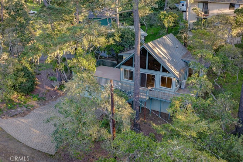 Welcome to your coastal retreat! Perched near the crest of the highly sought-after Lodge Hill neighborhood, this charming A-frame cottage sits west of Highway 1 in the idyllic, artist haven of Cambria. Surrounded by nature and offering mostly one-level living, this home is the perfect canvas for your coastal dream. Step inside to a bright, open-concept floor plan that instantly feels like home. The kitchen flows seamlessly into the living room, drawing your gaze up through dramatic A-frame windows that allow endless blue skies into your home. The cozy cottage features pine tongue-and-groove ceiling, and the main level features two generous primary suites. Both suites offer en-suite bathrooms, spacious closets, and dual-pane sliding doors that open directly onto the expansive wrap-around deck. The home is upgraded with dual-pane windows and sliders. Upstairs, a cozy loft overlooks the main living area—ideal for a home office, quiet reading nook, or an inspiring space for overnight guests. Stay comfortable year-round with a newer, efficient mini-split system for heat and air, plus a cozy stove in the living room for those cool coastal evenings. Step out onto the wrap-around deck to sip your morning coffee while watching deer graze and hawks soar overhead. Situated next to a large vacant lot to the southwest, the property offers a wonderful sense of privacy. Nature lovers will appreciate being just moments from the Fiscalini Ranch Preserve and its scenic upper trails. A 2-car garage is complemented by a paver driveway, providing an oversized area for additional parking. A sizable workshop area located just off the garage conveniently houses the laundry and a newer heater, maximizing the square footage in your main living space. Enjoy the unparalleled beauty of this quaint coastal town, renowned for its exceptional dining, charming shops, and relaxed pace of life. This home is thoughtfully priced to allow for repairs, improvements, and personal styling. Bring your vision and make this A-frame cottage your own!