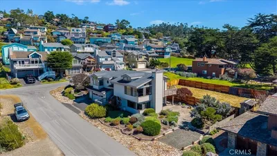 Nestled on a corner lot on the Marine Terrace, this substantial home offers an incredible spacious living experience. The home boasts light-filled rooms with vaulted ceilings and numerous view windows creating a flowing open floor plan with ocean views. The 120 foot long estate size lot allows for generous room sizes, while still allowing for outdoor gardens and patios. The living areas are located on the second floor to take advantage of the ocean views. These include the kitchen, living and dining rooms, primary suite, half bathroom and two decks. The open kitchen has a pantry, oven plus separate cooktop and an eating bar with space for 6 barstools. The deck off the dining room is the perfect spot for the bbq. There is a gas log fireplace in the living room to cozy up to at night. Convenient to everyday living, the primary bedroom is on the same level as the main living areas. It has an ocean view, sitting area, vaulted ceilings, two closets (one is a walk-in) and access to the back deck overlooking the garden. Downstairs are two more bedrooms, large laundry room including sink, a full bathroom and quite a few closets. The oversized two car garage allows room for your cars, bikes and kayaks so you can enjoy this incredible beach town of Cambria. The yard surrounding the home is filled with poured concrete aggregate patios and plants, ready for your enjoyment. There is an additional off-street parking area on the west side of the home for a small RV or boat. You can’t beat this location on the Marine Terrace. There are no hills to climb to access the beach or the nearby Fiscalini Ranch boardwalk and trails.