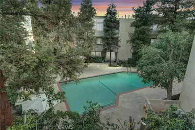 This light and bright, second-floor corner unit condo offers 2 bedrooms, 2 bathrooms, and over 1,000 sq ft of thoughtfully designed living space, tucked away from the street for exceptional privacy. Featuring laminate flooring and central air conditioning for year-round comfort. The well-appointed kitchen includes updated countertops, stainless steel appliances, a range, dishwasher, and microwave, all under two years old, and ample cabinetry. The living space opens to a private balcony overlooking the trees and community pool, perfect for relaxing mornings or evenings. In-unit laundry and a newer water heater add everyday convenience. The primary suite offering an en-suite bath and generous closet space, the second bedroom works beautifully as a guest room or home office. The home includes two dedicated parking spaces, one with a garage and storage. Well-managed community with resort-style amenities, including a pool and tennis court, all just minutes from Topanga Mall, West Hills Village, dining, shopping, and convenient public transit. Financing options available. Canoga Park at its best!