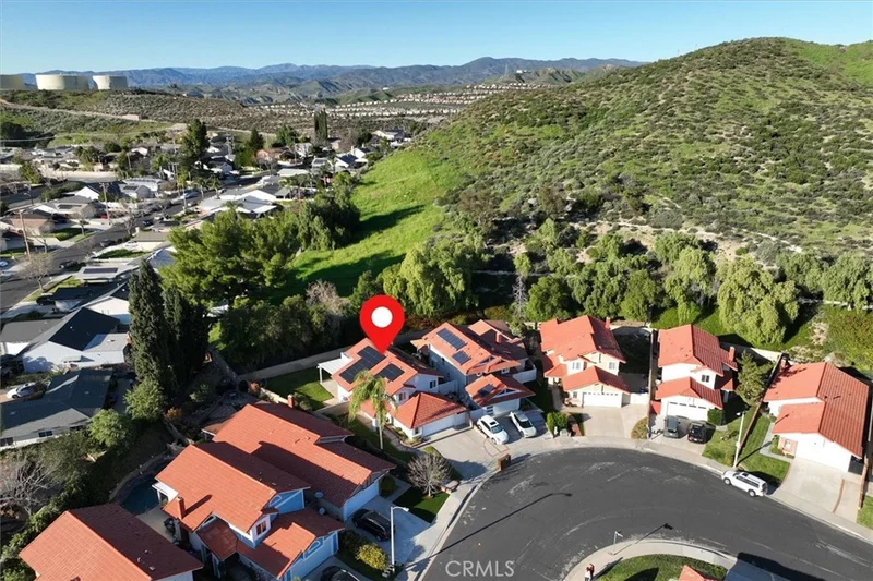 Welcome to this light and bright two-story home, perfectly situated on a quiet street with a large wrap-around yard, no rear neighbors, and serene hillside views. Step inside to the formal living room featuring soaring ceilings, oversized windows, and elegant French doors leading to the backyard, filling the space with natural light. Just off the entry is a versatile downstairs bedroom currently used as a den, complete with custom built-ins, a faux fireplace with heater, and mounted TV. Nearby, the beautifully remodeled downstairs bathroom features a tiled walk-in shower, newer vanity, and mirror. Continue down the hall to the kitchen, which offers granite countertops, a full tile backsplash to the ceiling, stainless steel appliances, recessed lighting, bar seating, and a dining area, with the laundry conveniently tucked away in a nearby closet. The spacious family room showcases a charming brick fireplace and sliding glass doors that lead to the private backyard, creating a cozy yet functional space for everyday living. Step outside to enjoy a large solid covered patio plus an additional slatted patio that allows for extra light, all backing to a gorgeous green hillside offering exceptional privacy and serenity with no rear neighbors. The expansive wrap-around grassy yard provides plenty of space for play, pets, gardening, or entertaining. Upstairs features three additional bedrooms, including a spacious primary suite with high ceilings and a large sliding glass door flanked by satellite windows, opening to an incredible balcony with sweeping hill views. The en-suite bath includes dual sinks and a walk-in shower. Two secondary bedrooms offer high ceilings, ceiling fans, and neighborhood and valley views, with a hall bath featuring a tub/shower combo. Additional highlights include laminate flooring throughout the downstairs, carpet on the stairs and upstairs, plantation shutters on every window, updated windows and glass doors, an updated HVAC system, a leased solar system that provides an annual Edison credit, and a low HOA that keeps the community beautifully maintained. Hurry! This is an exceptional opportunity you won’t want to miss.