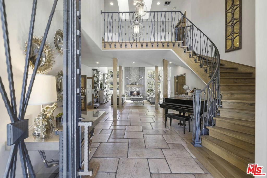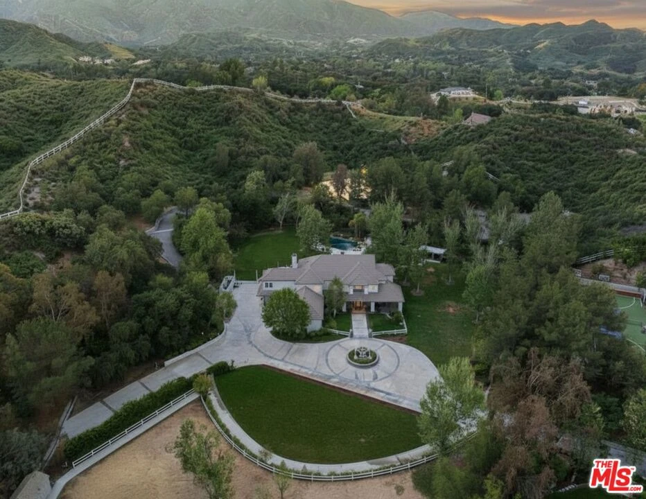 Welcome to your dream home in the prestigious Sand Canyon neighborhood! This California contemporary estate offers 5,134 sq ft of living space on a nearly 9-acre private and fully fenced property with serene mountain views. The gated drive leads to a grand circular driveway featuring a centerpiece fountain. A gorgeous custom metal front door opens into a sun-drenched great room with soaring ceilings, oversized windows, double doors leading outside, and a stunning custom statement fireplace, perfect for gathering or effortless entertaining. The formal dining room flows seamlessly from the main living space. The main level includes two well-appointed ensuite bedrooms with custom built-ins. The chef's kitchen is a true showpiece with a soapstone island, natural stone countertops, and custom cabinetry all opening seamlessly to the breakfast nook and family room. Enjoy the 6 burner Dacor range, double ovens, dual refrigerator/freezer, steamer and generous pantry storage. The expansive family room features exposed beams, a custom feature wall, an architectural fireplace with extended hearth, and a baywindow seat. Upstairs, an airy loft overlooks the great room. The primary suite is a private sanctuary with a fireplace, balcony views, and a sun patio with above-ground spa. A generous walk-in closet leads to a flexible bonus room. The ensuite bath offers dual vanities, a separate soaking tub, steam shower with rainfall feature and towel warmer, plus a laundry chute for added convenience. There are three additional bedrooms on the second floor, including one en-suite. Outside,enjoy a sprawling lawn, resort-style pool and waterfall spa, built-in BBQ, and a sport court lined for basketball and pickleball. A detached workshop/5-car garage, RV parking/electrical hookup, and generator system (with potential backup to the main house) complete this exceptional property. Whether you're dreaming of unforgettable gatherings, space for hobbies and toys, or a true retreat surrounded by nature, this property delivers a rare lifestyle in an exclusive neighborhood!