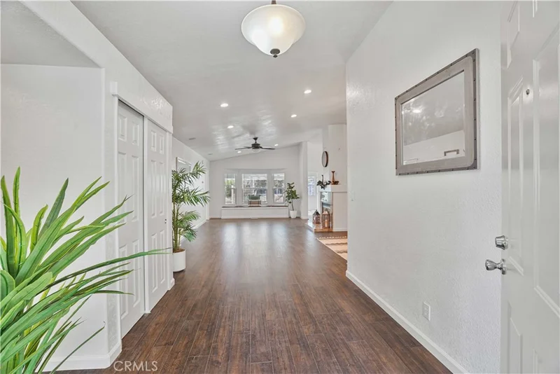 Spacious and beautifully upgraded 3-bedroom, 2-bath home with an additional bonus room that can be used as a fourth bedroom, office, or flex space. This is the largest floor plan offered in the community and features direct-access attached garage along with numerous modern upgrades throughout. The interior has recessed lighting, ceiling fans, and a combination of tile, new carpet, and luxury vinyl plank flooring. The open living area includes a granite fireplace and flows seamlessly into the dining and kitchen areas, creating a great space for everyday living and entertaining. The kitchen is beautifully updated with stainless steel appliances, built-in microwave, pendant lighting, bar-top seating, and wiring ready for a mounted TV, making it both functional and ideal for gatherings. The primary suite offers a relaxing retreat with a fully remodeled en-suite bathroom featuring an upgraded vanity, upgraded soaking tub, and a custom walk-in shower with built-in seating. The secondary bathroom has also been upgraded, showcasing granite countertops, upgraded sink and fixtures, and a modern glass shower enclosure. Step outside to a large, low-maintenance backyard with a covered patio, perfect for outdoor dining, entertaining, or simply relaxing while enjoying the premier view lot and stunning scenery. This home offers the perfect combination of space, thoughtful upgrades, and a desirable location, making it an exceptional opportunity in the community. Located in Canyon View Estates with a current monthly land lease of $1,900.81, the community offers amenities such as a 24-hour gated entry, 2 pools and spa, 2 sport courts, 2 play areas, a clubhouse, and RV storage. Conveniently located near parks, bike & walking paths, shopping, entertainment, schools, freeway, and Metro-link access. Home is a must see! Please submit pre-approval along with proof of funds with offer. Buyer to verify all before close of escrow.