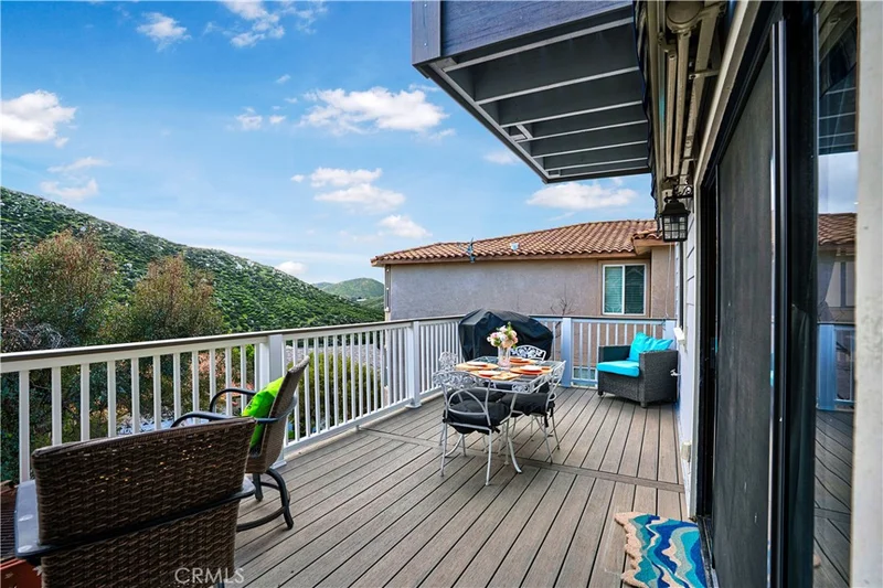 INCREDIBLE Mountain and golf course VIEW!! 4 Bedroom 4 bathroom home with just under 2700SF of living space including a lock-out MOTHER IN LAW/ ADU ON THE LOWER LEVEL with a full kitchen and 4 person SAUNA room. Walk in to a dramatic high ceiling entry and a large living room with connected dining space near the kitchen. One of the bedrooms is located on the main level and is currently being used as an office. Upstairs you will find the additional bedrooms including a large primary bedroom suite with jacuzzi tub and spacious walk in closet with built in dressers and shelving. The laundry is also conveniently located on this level. On the bottom level, the ADU space has its own oven, microwave, sink and refrigerator as well as a bathroom and versatile living space. This "mother-in-law/ Multi-Gen" space has a separate entrance and AC unit and may have possible income generation potential! In the main house, enjoy a whole house fan, a newer AC unit and an automatic roller shade on the main deck. New ceiling fans, fixtures and flooring have recently been updated as well as new underlayment for the roof replaced in 2026. Enjoy your privacy and view on the 3 trex decks over looking the backyard and canyon. The 2.5 car garage also has additional space for a golf cart and has a new garage door opener system. Canyon Lake is a gated golf and lake community with parks, a country club, events and activities each month, an equestrian center, ski lakes, baseball field, dog parks, pickleball, basketball courts, tennis courts, a lakeside campground and so much more. The Lighthouse Restaurant & Bar offers indoor and outdoor dining and event space right beside an Olympic-sized pool, sandy beaches and a play area. Near the community you can hike, bike, shop and enjoy the best of the Southern CA lifestyle! (BUYER TO VERIFY ALL)