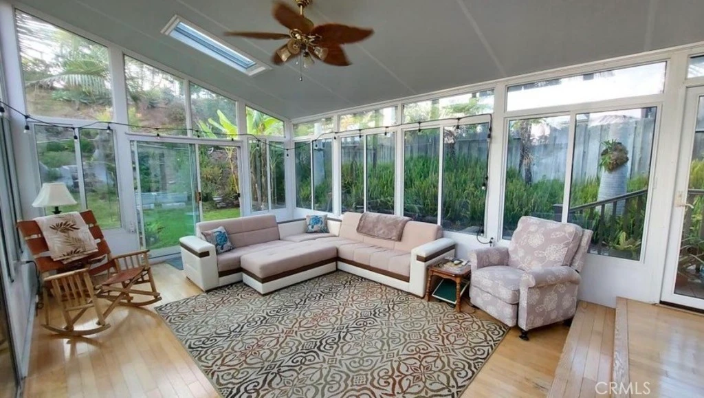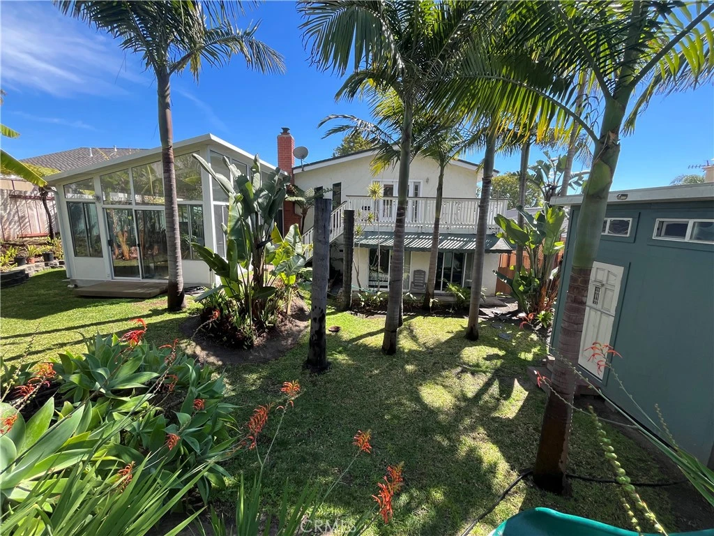 This beautiful 4-bedroom, 3-bathroom tri-level home in a desirable neighborhood in Carlsbad offers easy, living with thoughtful design. Step inside to soaring vaulted ceilings in the welcoming foyer, leading up to an open loft-style family room which has a full length bar for entertaining. The living/dining combination features a cozy gas fireplace with remote control for effortless ambiance. This opens up into a bright sunroom that beautifully frames the tropical backyard oasis. Note: The sunroom’s additional 322sf is not included in livable area. The split level design is ideal for comfortable living without excessive climbing. The primary suite includes a versatile bonus area with a loft bed, desk workspace below, and a convenient sink. Downstairs, the secondary bedroom connects to a permitted bonus room and full bathroom, can be used as an in-law floor plan, guest suite, or junior ADU, complete with a separate side-yard entrance for added privacy. Additional improvements include a newer roof, new system pavers in the driveway, fresh interior paint, a fully paid solar system for energy savings, whole house Halo water system and an electric car charging outlet in the garage. Enjoy outdoor living on the 200 sq ft deck off the family room, with stairs leading directly to the lush, gardener’s paradise backyard. This tropical retreat boasts mature palm trees and an impressive array of fruit trees. Additional backyard highlights include a charming shed combo with an upper deck, playhouse, and slide—perfect for extra storage. Nestled in popular Laguna Riviera—a no-HOA community with a true neighborhood feel—this home is just blocks from the scenic Agua Hedionda Lagoon for water sports and relaxing, and close to highly rated Kelly Elementary School. A rare blend of space, functionality, sustainability, and tropical outdoor living.