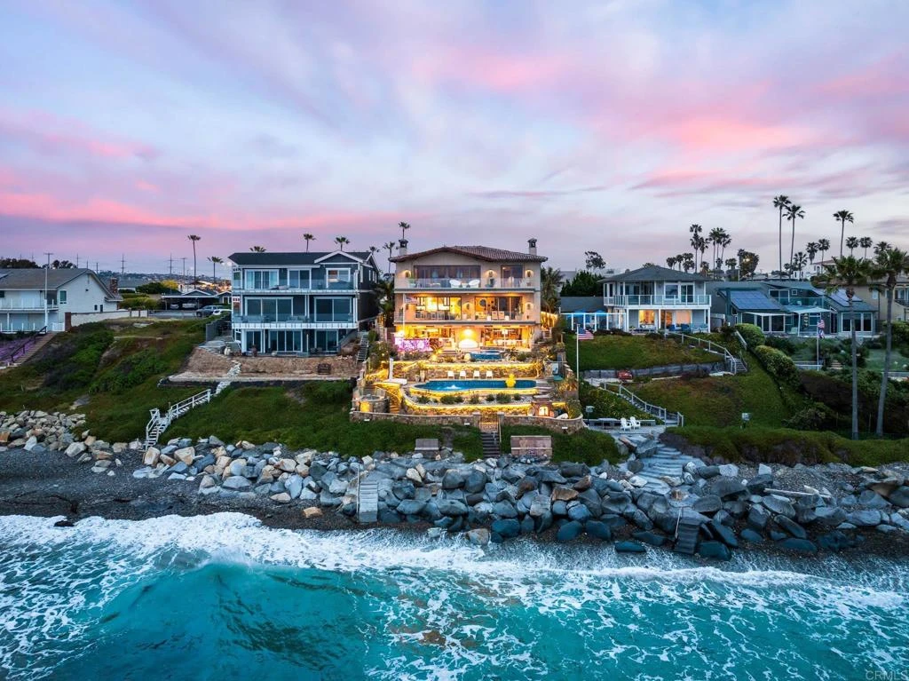 Experience unparalleled coastal luxury with this extraordinary beachfront estate, offering private beach access in the prestigious Tierra del Oro enclave of Carlsbad. Here, the rhythmic sound of white-water waves and vibrant sunsets over the Pacific are not just scenic moments—they're your everyday backdrop.Set on a rare, private 1/3-acre lot with 63 feet of direct ocean frontage, a pool overlooking the ocean (rare find and may not be able to be built again), this custom European-inspired masterpiece combines timeless craftsmanship with refined modern elegance. Meticulously updated throughout, the 6,480-square-foot residence offers up to 5 spacious bedrooms, 4 full bathrooms, and a stylish powder room, all thoughtfully arranged within a flowing open-concept design that seamlessly connects formal and informal living spaces.Every inch of this home has been curated with unmatched attention to detail—featuring rare, hand-selected stones and hardwoods, artisan-crafted finishes, and custom solid wood millwork. Designer lighting and fixtures elevate the ambiance, while a lighted custom staircase connects all three levels of the home, adding a dramatic architectural focal point.Retractable glass doors on every level blur the line between indoors and out, revealing panoramic ocean views stretching from La Jolla to Dana Point and inviting in the sea breeze. The result is a truly seamless indoor-outdoor living experience, ideal for both intimate relaxation and grand entertaining.Host with distinction with a stunning, glass-walled, temperature-controlled wine cellar paired with a sleek service bar, icemaker, and abundant storage—perfectly suited for gatherings and celebrations. Step outside to a breathtaking exterior oasis, complete with a lushly landscaped front courtyard entry, sparkling swimming pool(unique and may be hard to replicate), spa, and expansive summer kitchen with dining bar. Lounge by the fireplace or fire pit, sip cocktails as the sun sets, or dine alfresco under the stars, all while taking in uninterrupted views of the Pacific coastline. Additional exceptional features include: Steps leading to the private “wet sand beach”, Pool overlooking the ocean is a rare find and may not be able to be built again, Oversized 3-car garage, Office/library, Lutron lighting system, Five interior gas fireplaces, Outdoor heaters and shower, LED lighting throughout, Extensive exterior lighting, Copper gutters, downspouts, and trim, Custom storage for surfboards and water toys, Generous interior storage solutions. This exquisite estate is more than a home—it’s a lifestyle of unparalleled beauty, comfort, and coastal sophistication. Experience the very best of Carlsbad luxury living.