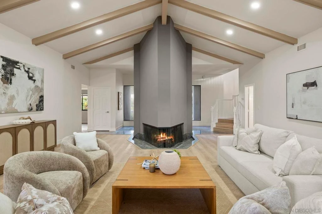 Completely renovated in 2026, this spacious residence offers 4 bedrooms plus an office and 3.5 bathrooms, blending refined design with timeless architectural character. Soaring vaulted ceilings and expansive windows fill the home with natural light, enhancing the open and inviting living spaces. Elegant finishes, luxury flooring, and a statement fireplace create a warm yet sophisticated environment ideal for both everyday living and entertaining. The entire upper level is the primary suite, a private retreat, featuring a balcony overlooking the golf course — the perfect place to unwind with a glass of wine while enjoying sunset views and even fireworks on the Fourth of July. Three additional generously sized bedrooms downstairs provide flexible space for work, guests, or growing households. Designed for seamless indoor-outdoor living, the backyard offers a resort-style setting with a sparkling pool and spa set against the tranquil golf course backdrop. The outdoor entertaining area is complete with a built-in kitchen including BBQ and bar seating, plus an inviting outdoor fireplace, creating an ideal setting for gatherings year-round. Set on a generous lot with potential for expansion or an ADU, this exceptional property combines space, privacy, and lifestyle. Located just minutes from top-rated schools, beaches, shopping, dining, and the world-class Omni La Costa Resort & Spa, this is a rare opportunity to own a turnkey golf course home in one of North County’s most desirable communities.