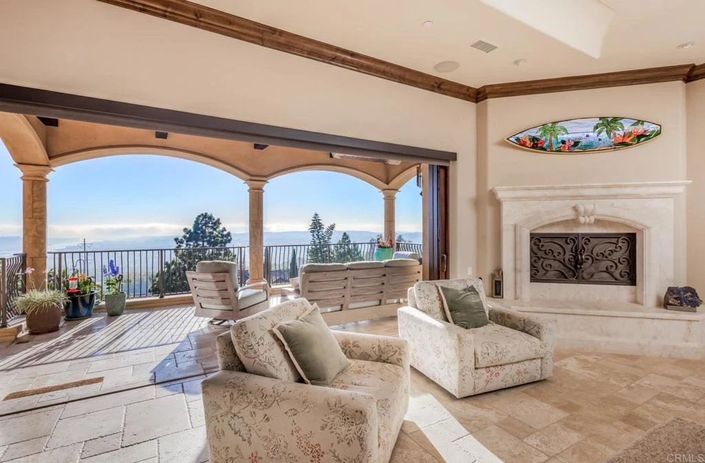 Unrivaled craftsmanship of a 2011-built Italian-Mediterranean estate showcasing a 180-degree lagoon and ocean view within one of Carlsbad’s most desired neighborhoods. Designed by Alex Friehauf, this residence blends artisanal craftsmanship with modern sophistication in an open-concept sanctuary where 15-foot pocket doors dissolve boundaries between refined interiors and 1,450 square feet of covered view decks, perfect for hosting with the backdrop of a vibrant Pacific sunset. Floor-to-ceiling 8-foot windows frame endless vistas of Batiquitos Lagoon, La Costa Resort, and distant Catalina and San Clemente Islands, accentuated by custom hardwood doors, tumbled travertine tiles, and bespoke wrought iron railings. First floor primary bedroom and an open floorplan that bathes every room in natural light, with a smooth Santa Barbara finish exuding timeless allure. The chef’s kitchen, an entertainer’s dream, boasts designer appliances, a prep kitchen, butler’s pantry and numerous custom cabinetry improvements. Outside, a solar-heated saltwater pool and spa, multiple entertainment areas that are complimented by drought-friendly landscaping, a thriving fruit orchard (passion fruit, peach, mango, fig, orange, plum, avocado, lemon), a new vegetable garden, and a greenhouse. A Buddha fountain and front waterfall whisper tranquility, while a terraced lot—city-approved for an ADU or potential tennis/sport court—offers additional possibilities. The primary suite indulges with hardwood floors, expansive walk-in closet with custom cabinetry, a soaking tub, newer steam shower and sauna. Recent improvements include a whole-house filtration system, Sonos surround sound, Leutron LED lighting system, custom window shades, three-zone HVAC, tankless water heaters, and solar electric system for unmatched efficiency. CAT6 wiring and a new security system keep you connected and secure. Storage is extraordinary, with a 3.5-car garage, utility “toy” garage, all with epoxy floors and additional under-house storage. The pinnacle of modern luxury. Ready for its next visionary owner to cherish North County’s most iconic views.