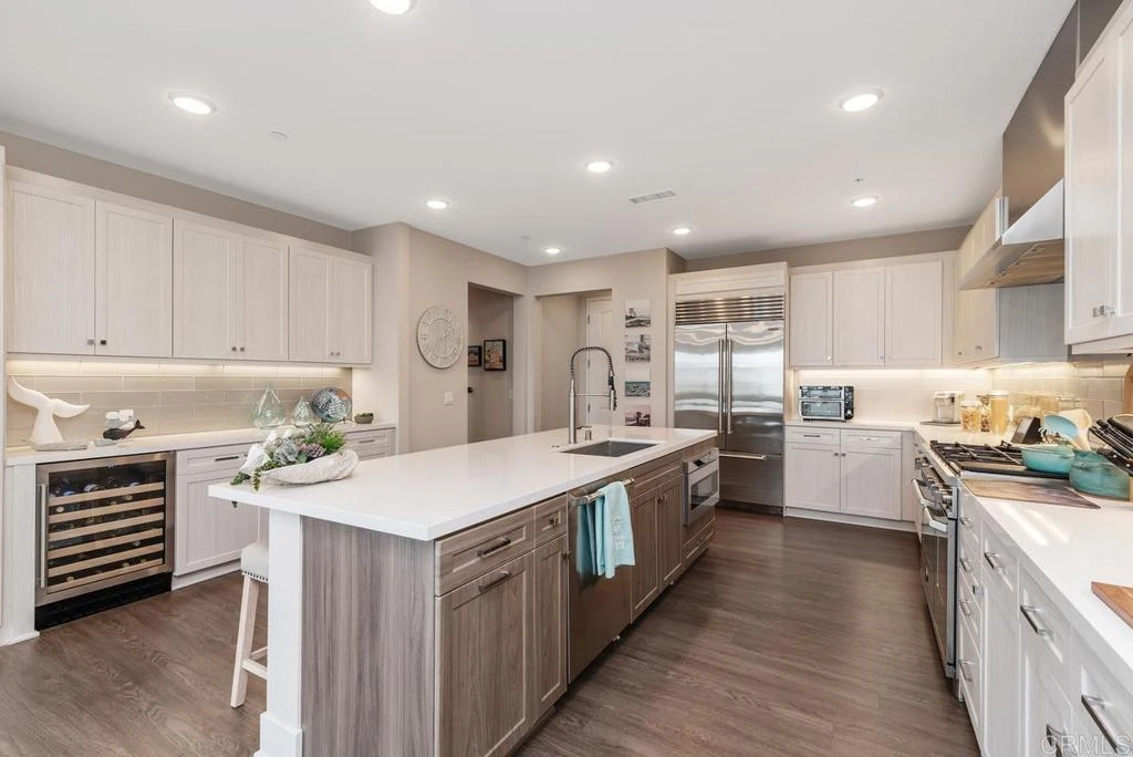 Beautifully upgraded single-level 2bd 2bth condo at The Carlyle, located in the heart of Coastal Carlsbad Village. Built in 2020, this sophisticated condo blends modern luxury with effortless coastal living, just steps from Michelin-starred dining, boutique shopping, weekly farmers markets, and Carlsbad’s renowned beaches. The home welcomes you with a bright, open-concept floor plan designed for seamless entertaining. The chef’s kitchen is thoughtfully appointed w/ a Bertazzoni 6 burner & double-oven range, Sub Zero refrigerator, wine refrigerator, quartz countertops, custom tile backsplash, and luxury vinyl plank flooring throughout. The spacious primary suite offers a generous walk-in California closet and an ensuite bathroom, creating a serene private retreat. A dedicated laundry room adds everyday convenience. The great room opens to an expansive private patio, perfect for year-round indoor-outdoor living. Enjoy serene pool views, ocean breezes, and a retractable screen, deal for morning coffee or evening relaxation. The patio is centrally located and accessible from every room, enhancing the home’s exceptional flow. Additional highlights include a secure gated community, controlled access, two assigned underground garage parking spaces, private storage unit, and direct elevator access from the garage. The residence is equipped with a tankless water heater and enjoys resort-style amenities, including a sparkling community pool. The ADA-approved building features wide, spacious hallways for added accessibility. This rare, turnkey opportunity offers the ultimate Carlsbad lifestyle, ideal for full-time living or a luxurious coastal retreat. Live where modern sophistication meets the sea in one of San Diego’s most vibrant beach communities.