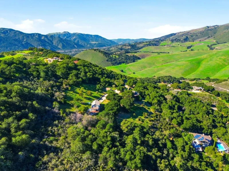 Nestled in the beautiful serene hills of Los Tulares, just minutes from Carmel Valley Village, is a unique private retreat. Enter via a curving stone-lined drive to arrive at a totally secluded oasis framed by statuesque oaks. Two distinct residences are connected by meandering stone paths, outdoor gathering areas, a peaceful waterfall and koi pond. The circular homes main floor features a warm, lodge-style living room with a wall of windows that bathe the space in natural light. A massive chandelier and stunning stone wood-burning fireplace add a cozy focal point, while the open kitchen and dining area make everyday living and entertaining effortless. Off this area, find the unique and comfortable primary suite, two full baths, and a flexible bonus room. Outside, a huge deck captures sweeping valley views of the prestigious "Village Ranches" and no neighbors, just lowing cattle. Downstairs, with access to the wine cellar, a separate lower-level suite offers its own kitchenette, bathroom, bedroom, living space, and separate deck with the same stunning view and easy access to both the front and rear of the property. Continuing further on the drive we find the separate two-story barn-style ADU with 1,484 sq. ft. of multi-purpose use, including 2 bedrooms, a bath, and kitchen.