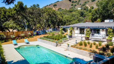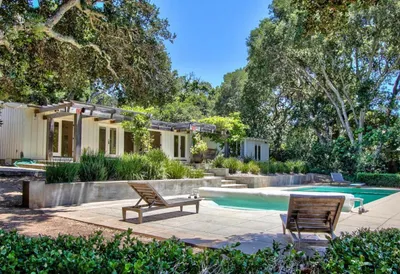 Nestled beneath ancient oaks with sweeping mountain views, this impeccably reimagined California ranch estate offers a rare blend of privacy, beauty, and sophistication. The 2,297 sq ft single-story main residence features soaring vaulted beam ceilings, wide-plank hardwood floors, and walls of glass that open to a stunning pool and gardens. The bright chef's kitchen features quartz countertops, a farmhouse sink, and custom cabinetry. The generous primary suite includes direct garden access, a spa-inspired bath with soaking tub, glass shower, and a custom walk-in dressing room. Outside, a string-lit pergola terrace runs the length of the home, terraced steps lead to a sparkling pool framed by lavender and mountain views, and a raised-bed kitchen garden adds charm and function. The detached guest quarters offer flexibility for guests, extended family, or a studio. A stone court with a fountain, mature oaks, and vibrant bougainvillea completes these incredible grounds.