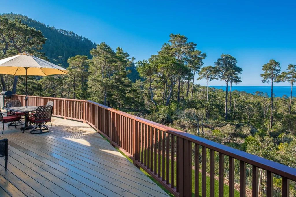 Pacific's Edge Sanctuary! 5 bedrooms / 4.5 bathrooms ~ Estate home sleeps 10-12. **This home has a 6 month minimum rental at $15K per month with a $15K Security Deposit. ** **There are also non-refundable cleaning fees.** Magnificent views of the Pacific ocean through a native Pine forest greet you when you arrive at this 16-acre estate perched on a ridge in the Carmel Highlands. The 4,600-square-foot California contemporary home has ocean views from almost every room and a breathtakingly beautiful landscape. *Ocean views from almost every room. *Living Room and Family Room and Den *Designer Decor and Furnishings *Patio with Furniture & Gas Grill *Gourmet Kitchen With Custom Cabinets & Gas Range *Seating at Dining Table for 10 *3 Gas Fireplaces *5-HDTVs *DVD Player, Cable Package Available *Internet DSL/Wifi Available *Luxury Beds and Linens *Beach Towels and Gear Provided *Spa Robes & Amenities *Washer and Dryer *Two Car Garage & Lots of Parking in the Driveway *Sleeping Options: Two masters each with king beds and en suite baths. Two bedrooms with queen beds share a Jack and Jill bathroom. 5th Bedroom has king or two twins and queen futon. **Pets OK upon owner approval**