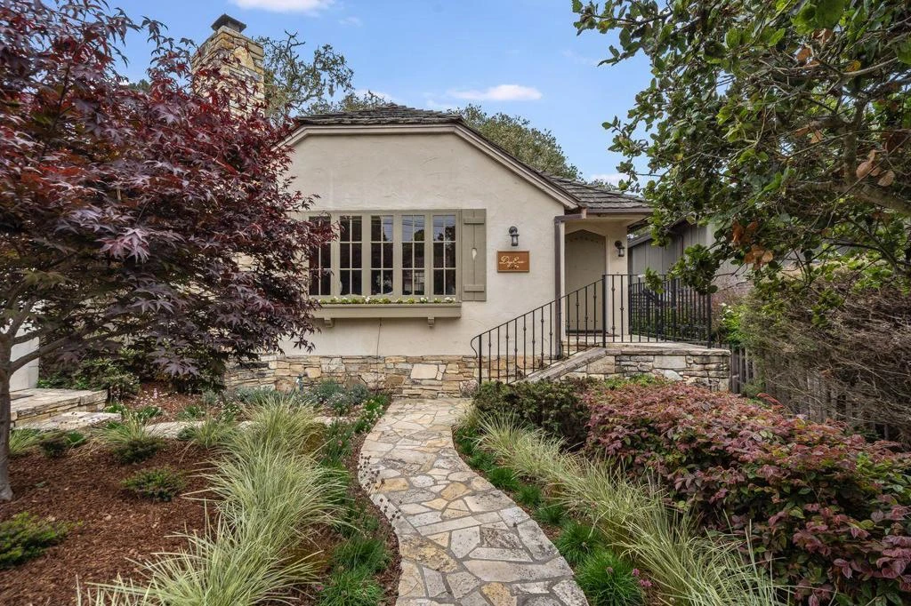 One story architectural gem. A picturesque gate leads to a dreamy, colorful garden. A stunning facade features a striking, stone chimney tower, large front windows, stone walkways & a rod iron framed porch. Luxury, modern comforts w/a classic old world charm & superb workmanship. Exquisite design details, w/2 stone fireplaces, give the interior a magical feel. An open floor plan Living/dining room w/high beam ceilings is filled w/light. Stylish hardwood floors tie all rooms seamlessly. An awesome kitchen w/SS appliances & travertine countertops enjoys views of gorgeous trees. The dining area & the roomy primary BR wrap around a splendid courtyard/patio, open via french doors for outdoor enjoyment, in a lush environment. Quiet & serene, Monte Verde Street at 4th Ave. is minutes from the beaches, golf clubs & from the world renown destination, Carmel-By-The Sea's charming downtown. Enjoy unique architecture, art galleries, restaurants, shops, historic buildings, & endless natural beauty.