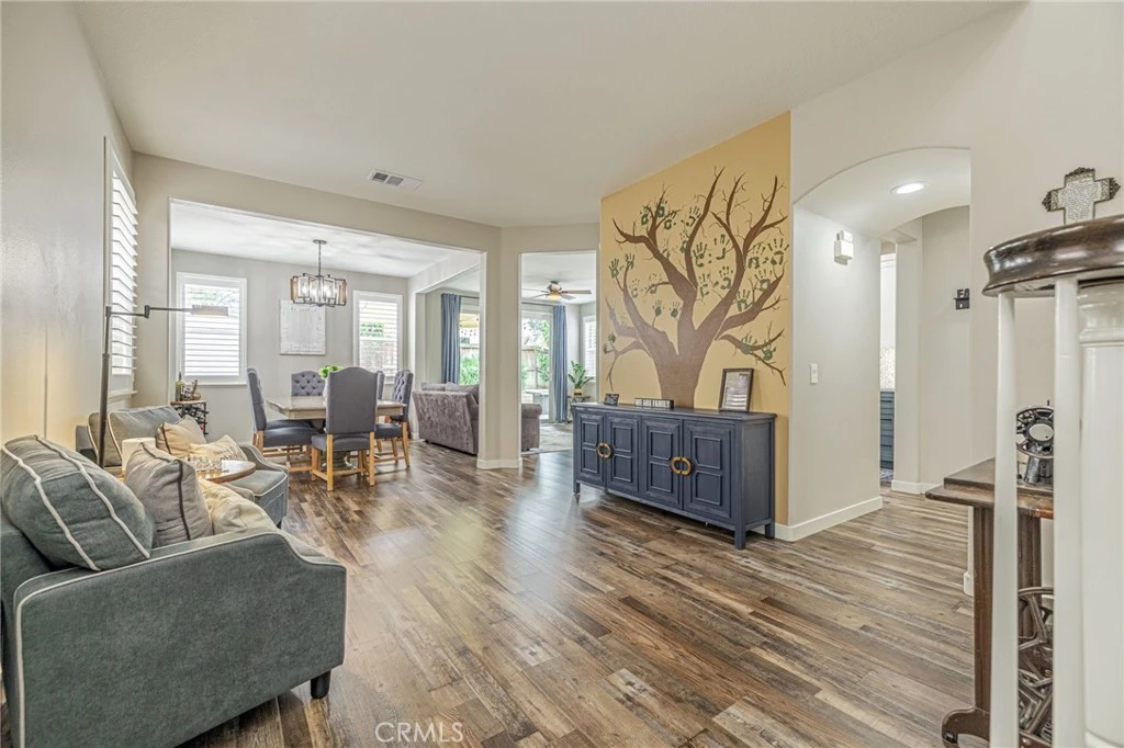 Welcome to this beautifully remodeled residence in the desirable community of Castaic, where thoughtful design meets elevated everyday living. This turnkey home offers 3 bedrooms, 2.5 baths, and a versatile flex space ideal for a home office, den, or guest room. The interior has been extensively upgraded with wide-plank luxury vinyl flooring throughout, complemented by a soft, neutral color palette that creates a warm and inviting ambiance. The fully redesigned kitchen is a standout feature, showcasing quartz countertops, custom shaker cabinetry, a marble backsplash, a Kohler farmhouse sink, built-in wine refrigerator with dedicated wine storage, and a custom range hood—perfectly blending style and functionality. All bathrooms have been tastefully remodeled with high-end finishes, including quartz and marble surfaces, custom vanities, designer tilework, and updated fixtures. The primary suite offers a spa-inspired retreat with a soaking tub and separate shower, creating a relaxing, resort-like experience. The living spaces are equally inviting, highlighted by a beautifully updated fireplace surround that adds warmth and a refined focal point. Additional enhancements include solid wood interior doors with sleek black hardware, custom shutters throughout, updated lighting at the entry and dining areas, and ceiling fans in each bedroom. A new custom sliding door opens to a serene, low-maintenance backyard designed for relaxation and entertaining, featuring ambient lighting, a shaded patio cover, raised planter beds with citrus, and spacious side yards with a garden shed for added functionality. Recently painted and meticulously maintained, this home offers a rare opportunity to own a truly move-in ready property with quality upgrades throughout.