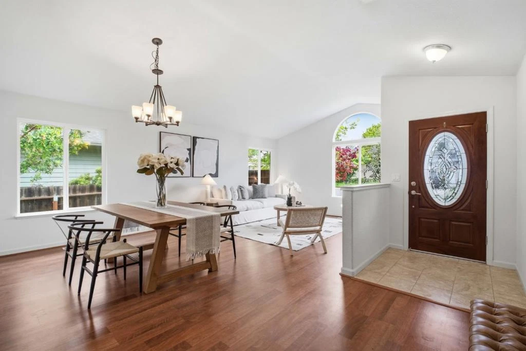 Welcome to this beautifully maintained home nestled in one of Castro Valley's most sought-after neighborhoods. Built in 2012, this 1,718 sqft residence sits on an expansive 9,440 sqft lot and offers the perfect blend of comfort, style, and space. Step inside to soaring vaulted ceilings and rich flooring that flows through the open living and dining areas, anchored by a cozy fireplace and flooded with natural light from oversized windows. The kitchen features granite countertops, a peninsula breakfast bar, stainless steel appliances, and warm maple cabinetry, ideal for everyday living and entertaining alike. The spacious primary suite is a true retreat, boasting cathedral ceilings, a private deck overlooking the backyard, a walk in closet, and an ensuite bath with dual vanity and glass enclosed shower. Two additional bedrooms and a full hall bath round out the thoughtfully designed floor plan. Out back, enjoy one of the largest lots on the street. A lush, fully fenced yard with mature fruit trees, a raised deck, and plenty of room to garden, play, or entertain. An indoor laundry area and 2 car garage completes the package. Power lines kept underground. Minutes to Castro Valley BART, top-rated schools, shopping, and freeway access. This one won't last.
