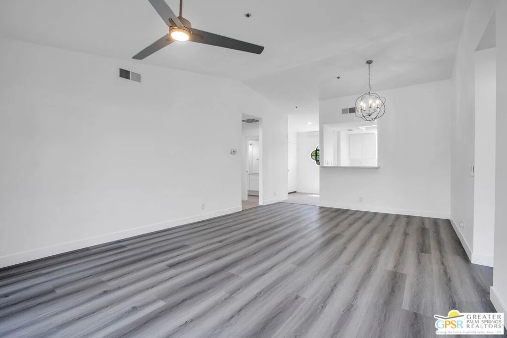 At last! Welcome to this spacious and beautifully updated 2-bedroom, 2-bath upper-level condo offering 1,197 SqFt in the highly desirable Cathedral Canyon Country Club. Filled with natural light, this home features soaring ceilings, generously sized bedrooms, and wood-look vinyl flooring for a clean, modern feel. Each room is equipped with ceiling fans and custom window treatments, adding both comfort and style.The kitchen is thoughtfully designed with recessed lighting, abundant cabinetry, stainless steel appliances, and a gas stove perfect for everyday living and entertaining. Enjoy stunning mountain views from every room, plus a spacious private balcony accessible from both the living room and the primary bedroom an ideal spot to relax and take in the scenery. Additional highlights include in-unit laundry with full-size side-by-side washer and dryer and convenient assigned covered parking nearby.