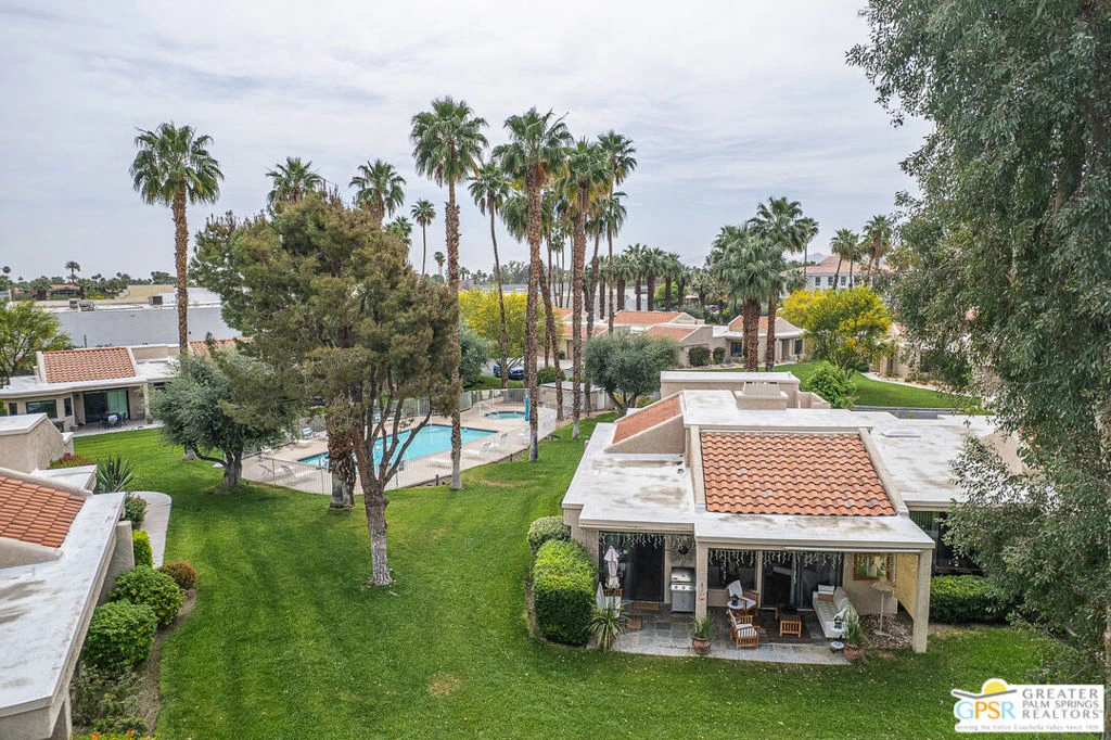 California Dreamin' and Good Vibrations!. These are two great California songs which help describe this wonderful spacious 3 Bedrooms and 2 Baths Condo on the 6th hole of the desirable Cathedral Canyon Country Club golf course. Be immediately welcomed with good vibes in this Desert California lifestyle living home and the entire complex extends the same feelings right at your doorstep. You are invited to visit your future and beautiful 3 bedrooms 2 baths home, right before you even enter, you encounter a meticulously maintained garden including from a small amount of desert plants and its lush tapestry of blooms variety, colors and fragrances. Find yourself indulging the aromas of an evergreen Rosemary Plant for the culinary enthusiasts, elegant scents of a Rose Plant, Lilly of the Nile, Indian Hawthorn and an all grown fragrant Plumeria well known to intensify its perfumes in the evenings and ideal for your leis creativity. Once inside you encounter spacious vaulted ceilings with skylight for a bright afternoon while entertaining friends and family. Making sure you give some use to the wet bar and fireplace by the living room. The bedrooms layout separation, provides privacy to your and guess and a centered atrium with a water fountain for calming sounds, movement and life, it is garden friendly with power water and drain perfect to create your own indoor spa like oasis. If you are looking for the best location condo in the complex, look no farther. It provides, from your private covered patio spectacular mountain views and colorful sunsets settling the afternoons and welcoming a full of stars night. Its green belts is perfect for morning walks, join your colleagues for a round of golf and/or just socialize. The pool and jacuzzi are just steps away from your front door. A two car attached garage for convenience and an enclosed patio out of the second bedroom facing South with a grown and productive pink grape fruit tree. Do not let this opportunity to own on the Cathedral Canyon Country Club slip by. HOA included; Internet, Basic Cable, Trash, Sewer, Common Areas Maintenance, Roof, Landscaping, Pools, Spas and the Social Life Style the in the community.