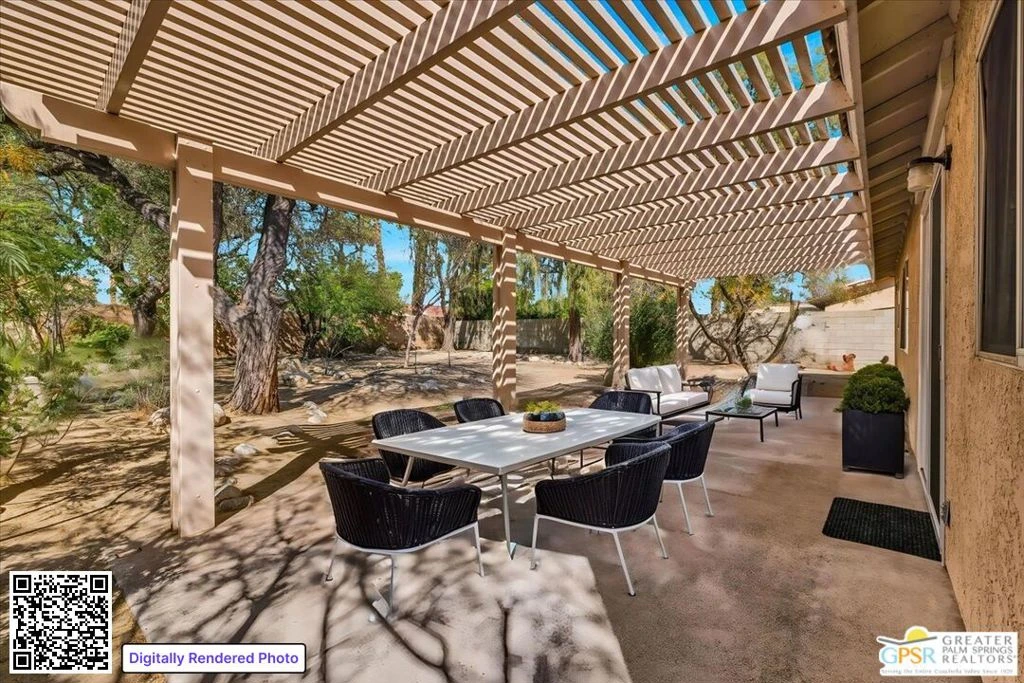 Well-Maintained Home with Spacious Yard in Panorama - Cathedral City. Welcome to this beautifully maintained three-bedroom, two-bath home situated on a generous lot in the desirable Panorama neighborhood of Cathedral City, just moments from Panorama Park and conveniently close to shopping, dining, and entertainment. Inside, the home features luxury vinyl plank flooring, a fresh neutral color palette, and custom window treatments, creating a bright and inviting atmosphere throughout. The living room offers vaulted ceilings, abundant natural light, and a striking elevated gas fireplace with tile surround, providing a warm focal point for the space. The kitchen also features vaulted ceilings and overlooks the dining area, maintaining an open and airy feel. It offers immaculately maintained original cabinetry, neutral tile countertops, and brand-new stainless steel appliances. From the kitchen and dining area, enjoy views of the expansive backyard - a wonderful extension of the living space. Step outside to a large covered patio perfect for outdoor dining, entertaining, or simply relaxing. The spacious yard features mature landscaping and established trees, offering both beauty and privacy. The primary suite features vaulted ceilings and a beautifully updated ensuite bathroom with a brand-new dual-sink vanity and mirrors, a newly sealed tub and shower combination with glass sliding doors, and a large walk-in closet. Two additional bedrooms provide flexibility for guests, family, or a home office, with one bedroom also featuring vaulted ceilings and additional storage space. A second bathroom with a newly sealed tub and shower combination offers convenient access for guests and the additional bedrooms. Additional highlights include a laundry closet with side by side Whirlpool washer and dryer, a finished two-car garage and the large gate with additional storage space in the side yard. With its spacious lot, great location, and move-in-ready appeal, this home presents a fantastic opportunity as a primary residence, starter home, or investment property in the heart of the Coachella Valley. *Images with furniture have been virtually staged.