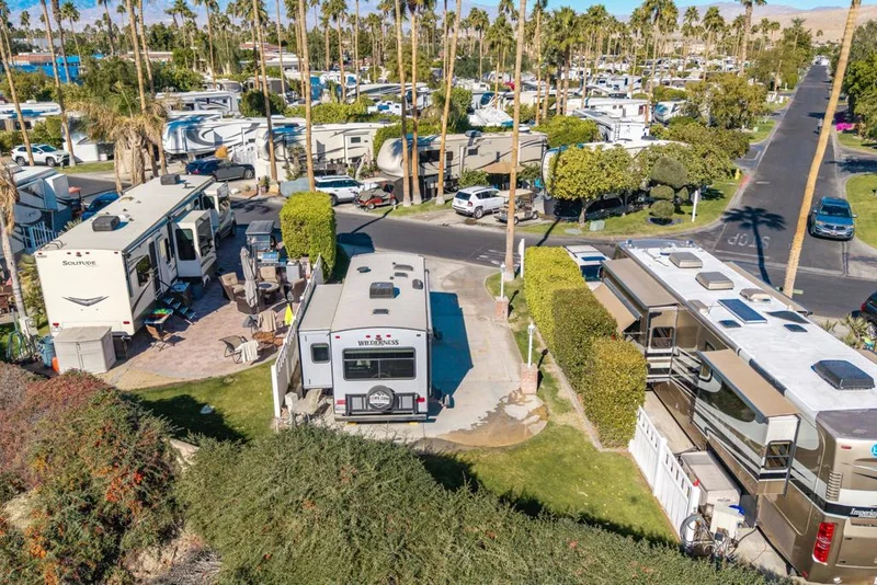 Discover this fantastic starter package in a prime resort location! This beautiful wall lot, conveniently located near La Palma Clubhouse and Satellite C, offers a private retreat with a lush greenbelt behind. Included is a 2018 Heartland Wilderness RV in like-new condition, providing the perfect balance of comfort and style. Whether you're looking for a seasonal escape or a full-time haven, this lot and RV combo is an incredible opportunity to own a piece of resort living. Outdoor Resorts Palm Springs is a Five Star RV Resort Community combining luxury with affordability. It is a guard gated resort that sits on 137 beautifully landscaped acres with 27 holes of executive golf, 10 tennis courts, 13 pickleball courts, 8 swimming pools, a fully equipped fitness center, sports bar, beauty salon/barber shop, full-service restaurant, convenience store, 2 club houses, activities, special events and so much more.Package price is $89,000 - Lot price is $70,000