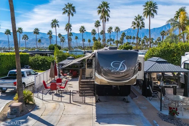 Beautifully expanded Lot 303 is located on the east side of Outdoor Resorts Palm Springs an All-Ages Active Resort Community. The lot features a newly constructed gazebo with electricity, curtain surround for privacy, tv mount and TV, a firepit table with 4 chairs and cushions, vinyl fencing on both sides and a 2018 DRV Mobile Suite Aire M-38, 39'11" in length, with custom wood steps w/storage & wood railing, soft side covers for lower part of fifth wheel. Interior Fifth Wheel Features Include: Corian countertops, center island, stainless steel farmhouse sink, 3 burner Furrion stove, convection microwave, molded tile backsplash with Jute edging, residential fridge/freezer with ice maker, pendant lights over the island, pantry, vinyl wood look flooring expandable wood table for 4, rear living room with 3 recliners, ceiling fan in living room, large windows let in the natural light, sleep number king size bed, 8 drawer dresser, 3 additional storage cabinets, Corian countertops in the bathroom with dual sink vanity, residential toilet, large shower area, stacked Splendide washer/dryer, large closet and plenty of storage space. Outdoor Resorts Palm Springs spans 137 beautifully landscaped acres and offers an unmatched resort lifestyle with 27 holes of executive golf, 10 tennis courts, 13 pickleball courts, 8 swimming pools, a fully equipped fitness center, sports bar (19th Hole), on-site salon/barber shop, café, and two clubhouses with year-round activities, events, and entertainment. Whether you’re seeking an active social scene or a peaceful desert retreat, this is more than a lot—it’s a lifestyle.
