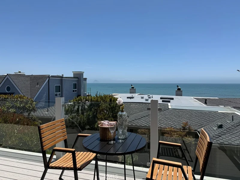 Enjoy some of the best views along Estero Bay, from the Cayucos Pier to Morro Rock, Montana de Oro, and beyond. This updated coastal condo is move-in ready, (ASK ABOUT KITCHEN PLANS) -- nestled along the pristine coastline north of downtown Cayucos in a six-unit complex. Watch the amazing SLO County sunsets, migrating whales, and ocean life—all right from the comforts of home. This two-story end unit maximizes window light without adjoining neighbors to the south and offers a private entrance with established landscaping. Entering the home, an open staircase leads up to southwest-facing, wall-to-wall windows in the open living and dining area, with the upper floor perched up above the neighboring condo rooflines. The large private deck adds outdoor living space with new glass panels to highlight the amazing coastal views. Upstairs you'll find a stately gas fireplace, cozy kitchen with views of Morro Rock, bar seating, a large pantry/linen closet, and full bathroom. There are two large bedrooms on the ground floor with ample closets, lots of additional hallway storage, full bathroom with modern upgrades, and indoor access to the attached garage, with room for a small vehicle, EV charger, and backup generator plus an additional assigned parking space in the private community lot. Call Cayucos home--close to many charming and relaxing coastal attractions, the Cayucos Pier, newly renovated Cayucos Landing Vets Hall, shops, restaurants, and the trailhead for Estero Bluffs State Park.