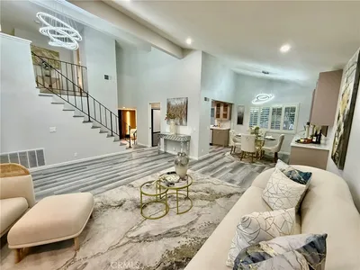 Welcome to this meticulously remodeled, two-level entertainer’s dream home, perfectly timed for summer enjoyment! Boasting over 2,000 square feet of elegant living space on a generous 6,849-square-foot lot, this 4-bedroom, 3-bathroom residence seamlessly blends modern sophistication with everyday convenience. A highly desirable main-floor bedroom and bath make it ideal for guests or multi-generational living. An impressive, oversized chocolate-cafe wood entry door with a decorative glass sidelight welcomes you into a sun-drenched interior, highlighted by a modern, geometric tiered crystal chandelier. The inviting living room features cathedral ceilings and recessed lighting, flowing naturally into a formal dining area. Neutral waterproof vinyl flooring runs throughout the entire home. The upgraded chef’s kitchen showcases quartz countertops and comes fully equipped with a five-burner cooktop, range hood, dishwasher, and a premium 3-door Samsung Bespoke refrigerator with a beverage center. The cozy family room is anchored by a romantic fireplace, tastefully modernized with acoustic slat wall panels and integrated LED lighting. Sliding glass doors create an effortless indoor-outdoor flow to your private backyard oasis, featuring a sparkling pool with fountain and heated spa. Upstairs, the spacious primary suite includes a walk-in closet and a double-sink vanity with a frameless LED mirror. Two additional bedrooms are well-appointed, sharing a modern hallway bath. Additional features include a durable tile roof, covered RV parking, a two-car garage with direct interior access and laundry hookups. Situated in the prestigious ABC Unified School District, this home is just minutes away from the premier Los Cerritos Center with specialty stores and popular restaurants, offering convenient access to all major SoCal freeways. Make your dream a reality with this stunning turn-key home!