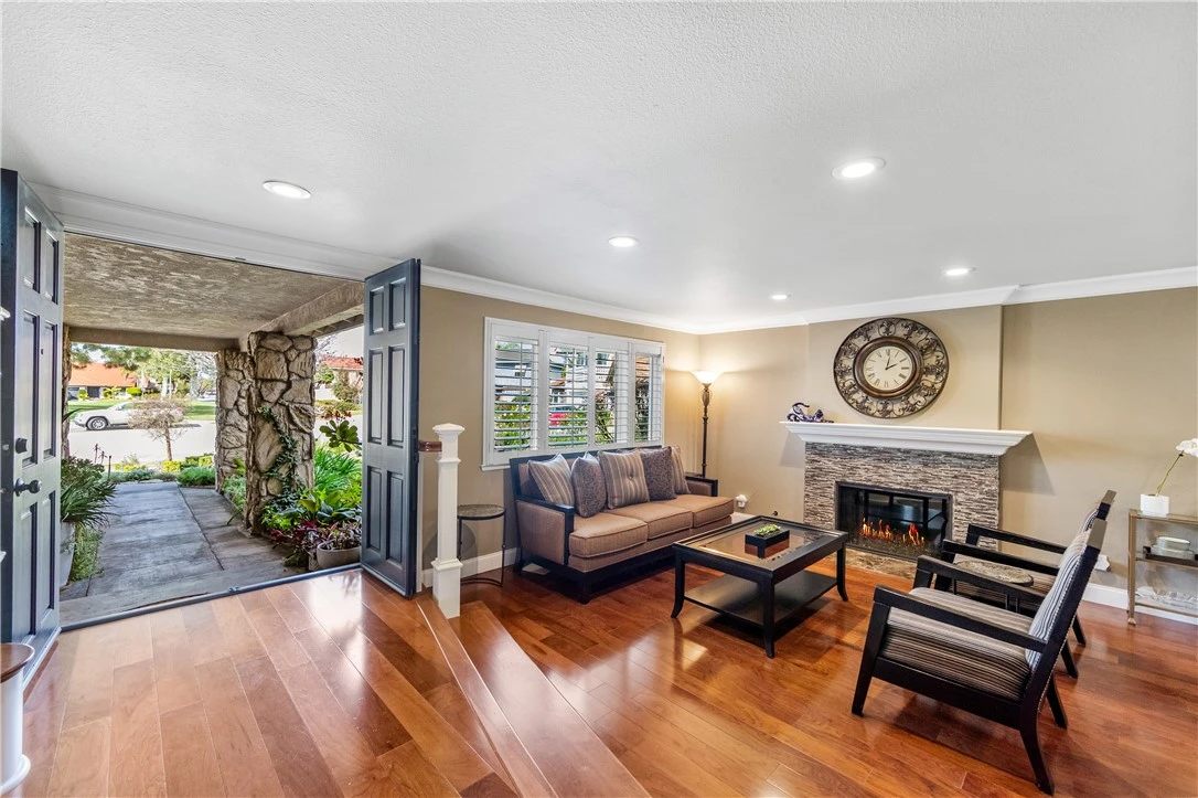 Nestled on a cul-de-sac, across the street from Saddleback park in the highly desired community of Cerritos, this former city of Cerritos citywide pride home award winner is truly a dream come true! Approaching the home the excitement starts with an oversized driveway that allows ample room to park multiple cars or an RV. Double entry doors lead to stunning hardwood floors that flow through this beautifully remodeled home. First impressions last with a step down formal living room complete with a custom stack stone fireplace, an oversized white mantel, and a fire and ice design. This space is ideal for gathering or relaxing. The great room style first floor offers 2 living areas and an open-concept dining room leading to the fully remodeled Chef's kitchen. This kitchen features granite countertops, cherry shaker cabinets and High End Luxury appliances including a Viking range with matching microwave and an oversized Subzero refrigerator. Thoughtfully designed and meticulously maintained this home has all the upgrades! A counter height peninsula leads into the second living area that boasts direct garage access. The convenience continues with a powder room downstairs for guests and a small office area that leads to the finished garage, which boasts custom cabinetry, epoxy floors, and built-in attic storage. Upstairs, the comfort continues with a massive primary suite that includes a fireplace, an ensuite bathroom and 2 closets, one of which is a walk-in. 3 more bedrooms and 1 more bathroom complete the upstairs. With smooth ceilings, recessed lighting, crown molding, dual pane white vinyl windows, custom shutters and newly replaced HVAC system within the last year, this home is truly one of a kind! A true entertainer's delight, the vast backyard is the perfect size and offers multiple seating areas including a fire pit, wrap-around alumawood patio cover cpmplete with ceiling fans and chase lounges and eating areas by the pool. The sparkling pool and spa has been resurfaced with pebble tec and has recently installed pool pump and gas heater. The home also has a pool solar heating system to allow the Attending award winning ABC school district, freeway close for the commute and shopping close for convenience, this home will not last!