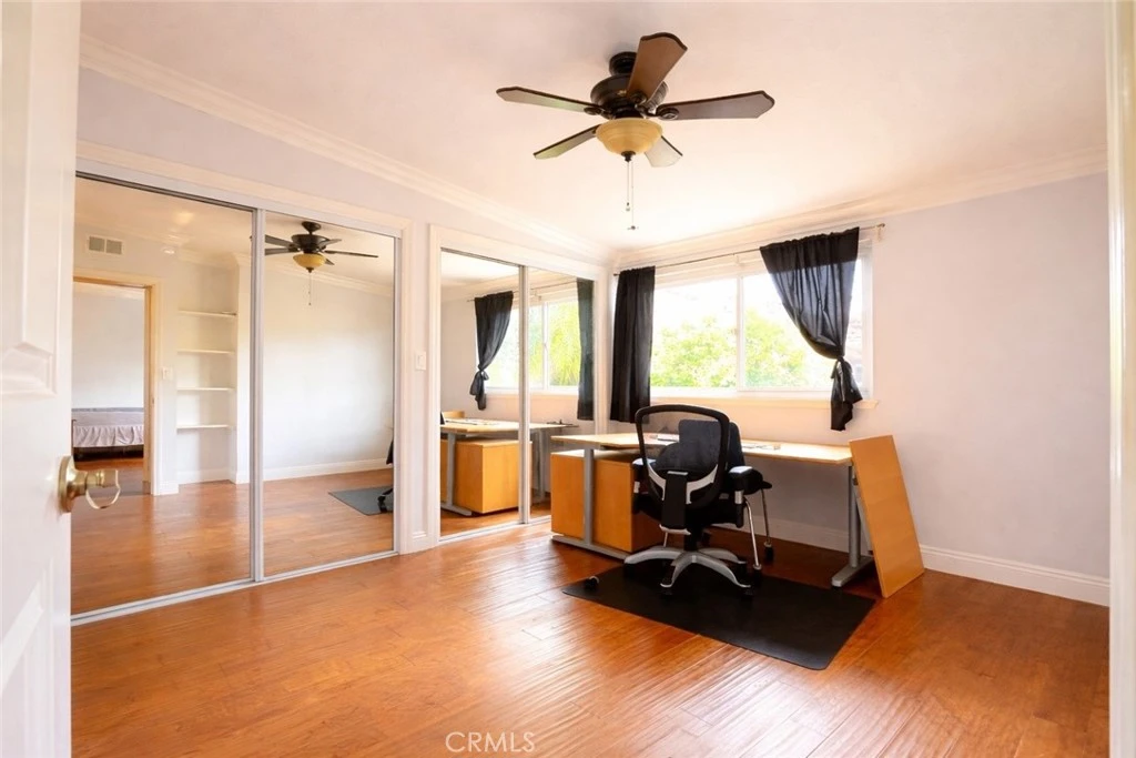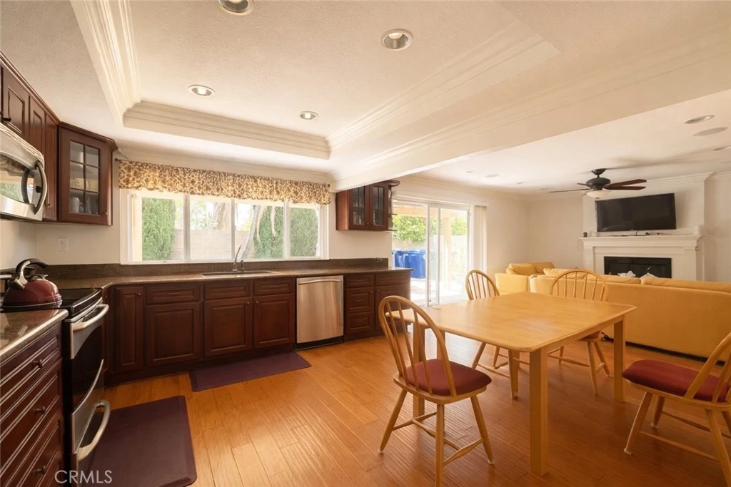 Welcome to this beautifully maintained home offering a bright, open layout and warm, inviting finishes throughout. The spacious living room features rich hardwood flooring, recessed lighting, and a cozy fireplace, creating the perfect setting for both relaxation and entertaining. Large sliding glass doors seamlessly connect the indoor living space to the backyard, filling the home with natural light. The kitchen is well-appointed with ample cabinetry, generous counter space, and a charming dining area overlooking the yard, ideal for everyday meals or hosting guests. A grand entry with soaring ceilings and an elegant staircase sets a welcoming tone upon arrival, while multiple versatile rooms provide flexibility for a home office, guest space, or creative use. Upstairs, the bedrooms are comfortable and well-sized, including a serene primary suite with mirrored closet doors and abundant light. The bathrooms are tastefully updated with modern finishes, offering both style and functionality. Outside, the private backyard presents a great opportunity for outdoor enjoyment, gardening, or personalization. Completing the home is attractive curb appeal with a manicured front yard and a two-car garage. This property combines comfort, space, and potential in a desirable setting.