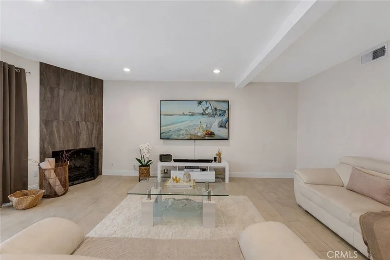 Welcome to this desirable corner-unit townhome featuring vaulted ceilings in the well-maintained Topanga South Townhomes community in Chatsworth. With only one shared wall, this home offers added privacy and natural light. The interior features a spacious living room with recessed lighting, smooth ceilings, and laminate and tile flooring throughout. A cozy fireplace with a custom tiled surround creates a warm focal point, while large sliding glass doors open to a private patio, ideal for relaxing or entertaining. The remodeled kitchen showcases dark wood cabinetry, quartz countertops, a mosaic tile backsplash, stainless steel appliances, and a farmhouse sink beneath a window. The adjacent dining area with vaulted ceilings enhances the open, airy layout and provides excellent flow for everyday living and gatherings. Upstairs, the primary suite offers vaulted ceilings, laminate flooring, and generous space. The remodeled en-suite bathroom features a dual-sink vanity, LED-lit mirror, modern fixtures, and a walk-in shower with a frameless glass enclosure and rainfall showerhead. The secondary bedroom is well-sized and versatile, and the updated hall bathroom includes a tub/shower combination with contemporary finishes. Additional highlights include a direct-access two-car garage with epoxy flooring and built-in storage cabinetry. The tree-lined community offers resort-style amenities, including a pool and spa, and is conveniently located near shopping, dining, hiking trails, major freeways, and the scenic Topanga Canyon area.