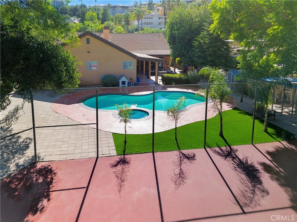 This fully renovated estate sits on a private 0.61-acre lot, offering a rare blend of luxury, comfort, and resort-style living. A light-filled foyer opens to elegant living spaces, including a formal living room with fireplace, an entertainment area with bar, and a dining room overlooking manicured grounds. Designed for seamless indoor-outdoor living, the home features an open layout with high ceilings, dual fireplaces, and expansive sliding doors leading to a family room and vine-covered outdoor dining area. The remodeled chef’s kitchen showcases high-end finishes and premium stainless steel appliances. The residence includes four spacious en-suite bedrooms with walk-in closets. The primary suite offers dual walk-in closets with a built-in safe and a spa-style bath with sauna and jacuzzi. Resort-style grounds feature a pool, multiple seating areas, a professional tennis court, a basketball court, and a private bike track. The property is also designated as a horse property, with ample space for equestrian facilities. Additional highlights include a three-car garage, RV access, and parking for six vehicles. Situated in a highly exclusive enclave favored by Hollywood elite and high-profile individuals, this property offers exceptional privacy and prestige. The neighborhood is renowned for its serene environment, expansive estates, and close proximity to the heart of the entertainment industry, making it one of Los Angeles’ most desirable residential locations.