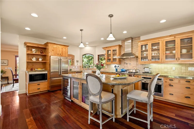 Fabulous Mediterranean Custom Home with Expansive Views & ADU This stunning Mediterranean-inspired custom home is designed for both comfort and elegance. Perched to take in breathtaking canyon and valley views, it offers a lifestyle of luxury, versatility, and relaxed sophistication. On the main level, the primary suite is a true retreat with its expansive spa-like bath, walk-in shower, and generous closet, plus private access to a serene courtyard with fountain. The living room impresses with its soaring beamed ceiling, a large gas fireplace with custom mantle and hearth, and French doors that open to a spacious tiled deck overlooking the valley—perfect for entertaining or simply enjoying the view. A formal dining room extends the gathering space further, opening to its own covered tiled patio for seamless indoor-outdoor living. The gourmet kitchen is the heart of the home, featuring a large gas range with a wall-mounted pot filler, an additional electric oven, a granite-topped island, and a walk-in pantry. Extensive storage includes deep drawers and a custom spice drawer, while a window above the sink captures views of the backyard. The kitchen flows effortlessly into the family room and breakfast nook, warmed by a free-standing gas stove—ideal for both cozy nights in and lively gatherings. The home’s craftsmanship is evident in the solid cherry and maple floors and the custom hand-painted tiles accenting the staircase. Upstairs, you’ll find additional bedrooms, office space, a kitchenette, and loft areas—perfect for family, guests, or flexible living. Amenities abound, with both attached and detached garages, abundant attic storage, a whole-house fan, and attic fans. Outdoor living continues to impress with balconies and patios off bedrooms that frame sweeping canyon and valley views. A fully self-contained ADU offers its own washer/dryer, kitchenette, bath, and private patio—perfect for extended family, guests, or rental opportunities. Behind the detached garage, an insulated finished bonus space with wall heating and cooling provides the ideal setting for a craft studio, music room, gym, or whatever you imagine. Set on over half an acre, the grounds are water-efficient yet lush, hosting more than nine varieties of citrus and fruit trees, elevated garden boxes, a bocce ball court, and a sprawling tiled deck designed for large gatherings. At day’s end, the sunset views across the valley will truly take your breath away.