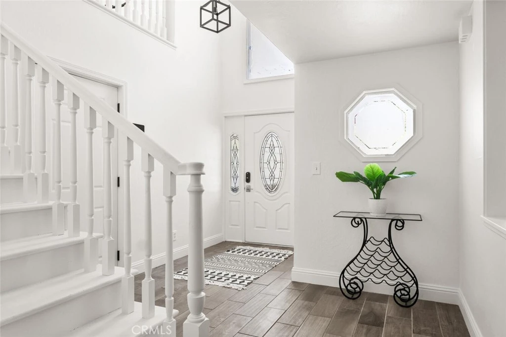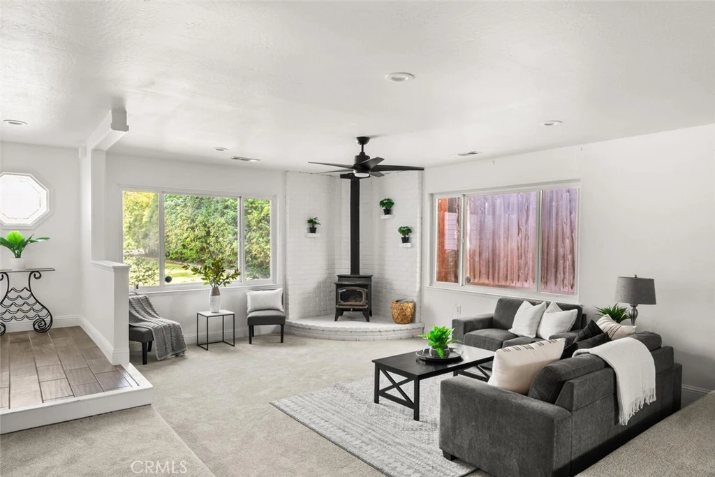 OWNED SOLAR, SPARKLING POOL on HALF ACRE LOT!! All bedrooms downstairs, plus an office and HUGE bonus room! This gorgeous property offers the perfect blend of comfort, space, and outdoor living. Fresh new paint, carpet, and updated fixtures throughout give the home a bright, refreshed feel. The inviting sunken living room features a brick-surround wood-burning fireplace, recessed lighting, and a warm, welcoming atmosphere. Just off the living room, a private office with double French doors creates an ideal work-from-home space. Upstairs, the enormous bonus room boasts new LVP flooring, tall ceilings, abundant natural light, and a built-in entertainment center—perfect for a game room, media space, or additional living area. The kitchen offers farm-style white cabinetry, stone counters, tile flooring, a double oven, and a beautiful tile backsplash. All bedrooms are conveniently located downstairs in a functional split floor plan, with the spacious primary suite privately positioned at the back of the home. The primary bedroom features French doors to the backyard, a large closet, and an ensuite bath with dual sinks and a tub/shower combo. Step outside to your own backyard retreat featuring a sparkling gated pool, gazebo, expansive lawn, and large fire pit—perfect for hot summer days by the pool and cozy evenings gathered around the fire. At the back of the property, enjoy a private fruit orchard with avocado, apple, mandarin, and lemon trees. This spacious half-acre property offers the perfect blend of indoor comfort and outdoor living.