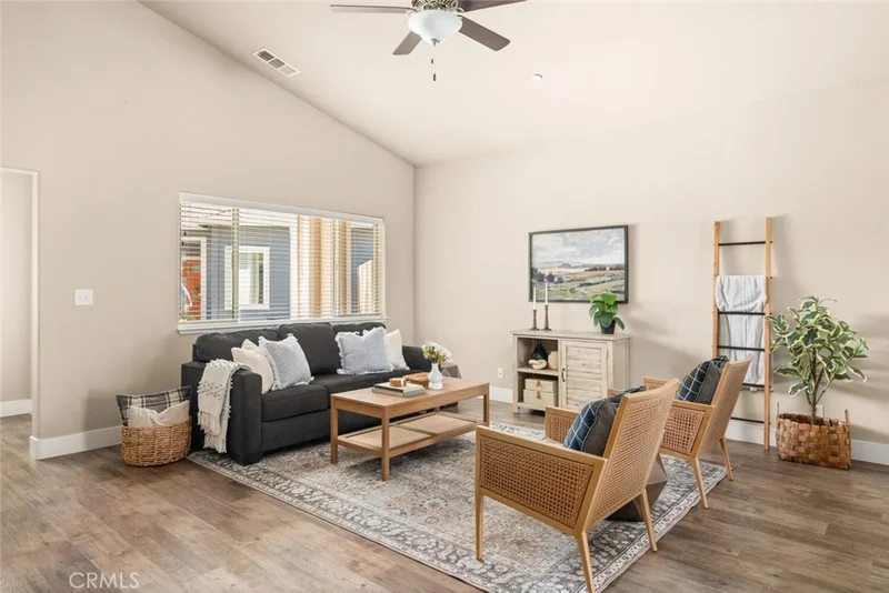 Constructed in 2019 with owned solar, and showcasing exceptional attention to detail, this home rests on one of the most spacious lots within this serene neighborhood. From the moment you step inside, you’re welcomed by a bright, modern interior featuring luxury vinyl plank flooring, 9-foot vaulted ceilings, soft neutral tones, and a highly desirable open-concept layout that creates an airy, inviting atmosphere. The thoughtfully designed kitchen is perfect for everyday living and entertaining alike, showcasing granite countertops, rich wood cabinetry, sleek modern appliances, a gas range, and a spacious center island with breakfast bar seating. Retreat to the generously sized primary suite, complete with elegant tray ceilings, private backyard access, dual closets, and a spa-inspired bathroom offering double sinks and an oversized walk-in shower. Additional highlights include recessed lighting, ceiling fans throughout, a separate indoor laundry room, owned solar, and a spacious two-car garage. Step outside to a newly landscaped backyard designed for both relaxation and fun. Enjoy summer evenings under the covered patio with ceiling fan and recessed lighting, play on the lush green lawn, or take advantage of the extra space to create your own garden oasis. With its extensive list of amenities, prime location, and fresh, contemporary feel, this home truly offers the ideal setting to unwind and enjoy life.