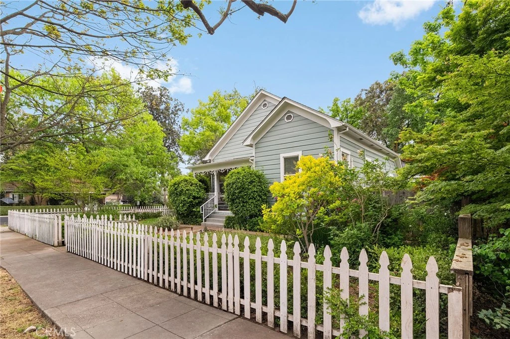 Welcome to this storybook home that blends classic Chico character with updated amenities and solar. A white picket fence, cobblestone pathways, mature landscaping and an inviting front porch set the tone before you step inside the mahogany door. Soaring ceilings and rich floors enhance the bright, spacious living room, anchored by a large bay window perfect for sunlight and reading nooks. The dining area and kitchen are ideal for entertaining, featuring white cabinetry, white appliances and a built-in buffet. Three roomy bedrooms offer updated flooring and high ceilings for an airy feel. The bathroom is timeless with black-and-white tile and a new shower. Thoughtful details include crown molding, wood-paneled doors, dual-pane windows with blinds, and convenient indoor laundry. Outside, the fully gated backyard provides privacy and a generous patio for relaxing, BBQs or weekend brunches. Excellent location—just moments from Bidwell Park and Downtown Chico. A beautifully maintained home with timeless curb appeal and modern livability.