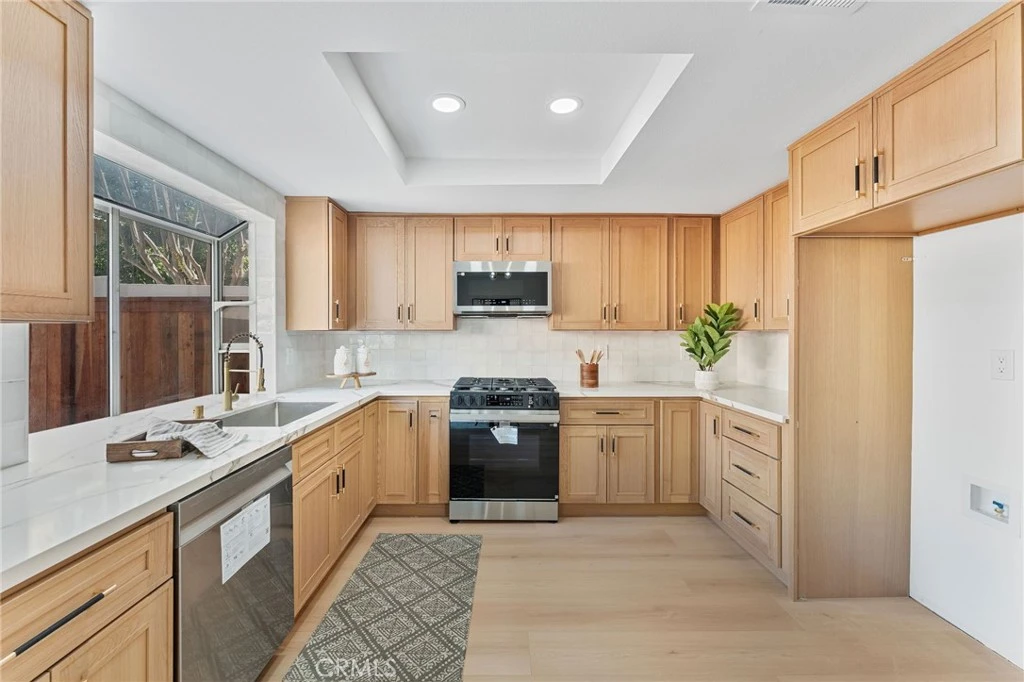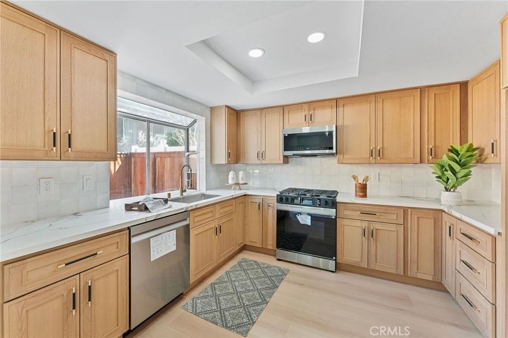 Beautifully updated Butterfield Ranch home featuring a bright, open floor plan with modern finishes throughout. The remodeled kitchen showcases warm wood cabinetry, quartz countertops, tile backsplash, new appliances, recessed lighting, and a large window that fills the space with natural light. The kitchen opens seamlessly to the living and dining areas, creating an inviting layout ideal for everyday living and entertaining. The spacious living room offers high ceilings, abundant natural light, and stylish staging that highlights the home’s contemporary design. The remodeled bathrooms feature modern wood cabinetry, sleek fixtures, designer lighting, and elegant tile flooring with a clean, updated aesthetic. This thoughtfully updated home combines comfort, style, and functionality. Please reach out today for your exclusive and private tour today.