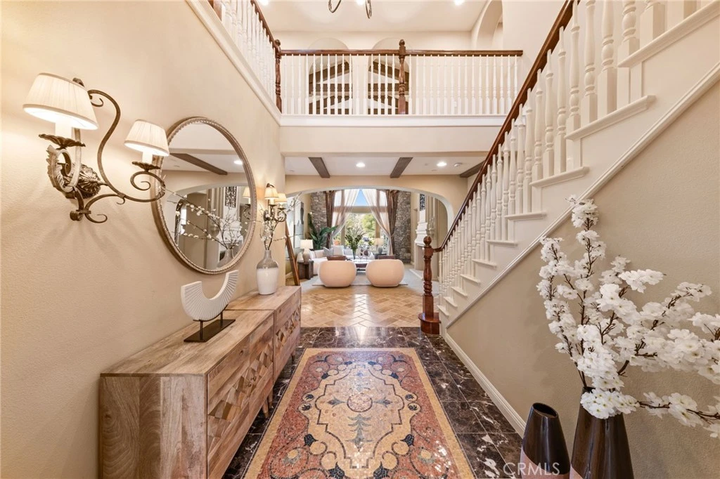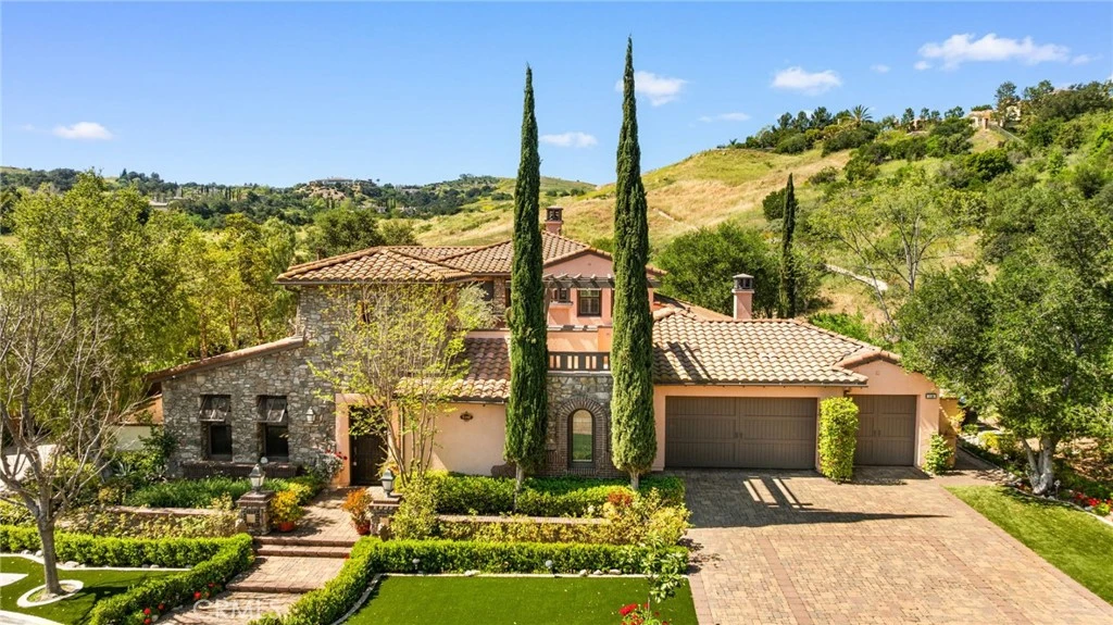 Former model home! Primary suite downstairs! Located in the prestigious 24-hour guard-gated Vellano community of Chino Hills, this exceptional Tuscan-style estate offers 5,432 sqft of living space on an oversized 24,025 sqft lot, combining privacy, elegance, and functional luxury. A private front courtyard welcomes you into the property, featuring a detached casita—ideal for guests, multi-generational living, or a private entertainment space. Inside, the home opens to a grand living area with soaring ceilings and a beautifully designed fireplace, creating an impressive and airy atmosphere. Natural light fills the space, enhancing the home’s open and refined layout. The main level includes a spacious private office with built-in bookshelves and with direct courtyard access—perfect for working from home. The gourmet kitchen is designed for both everyday living and entertaining, featuring dual center islands, premium granite countertops, and stainless-steel appliances, including KitchenAid built-in refrigerator, 6-burner cooktop with griddle, dual ovens, built-in microwave, dual dishwashers. The kitchen flows into a generous family room with direct access to the backyard and views of the rolling hills beyond. The property has second wok kitchen, ideal design for daily cooking. The family room with built-in media center and fireplace. The formal dining room with custom wood beams and custom chandelier. The primary suite is conveniently located on the first floor, offering a retreat area, dual walk-in closets, and direct access to the backyard for seamless indoor-outdoor living. Primary bathroom with large shower, soak bathtub, dual sinks. Upstairs, three well-appointed en-suite bedrooms are positioned along a wide hallway, each offering its own private bathroom for comfort and privacy. A lot of notable features, including marble flooring, custom two-tone paint, premium wallpaper, custom window coverings, crown moldings, large laundry room with sink. The backyard is expansive and thoughtfully designed, offering exceptional privacy. Enjoy outdoor living with a built-in BBQ, covered pavilion, and open space to relax or entertain, all set against scenic hillside views. A long private driveway leads to an additional flat area, providing endless possibilities for future expansion, a sport court, or custom outdoor enhancements. As a former model home, the property showcases quality finishes and thoughtful design throughout.