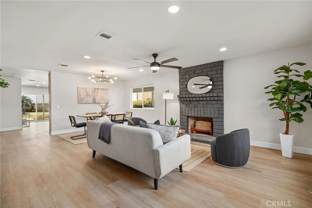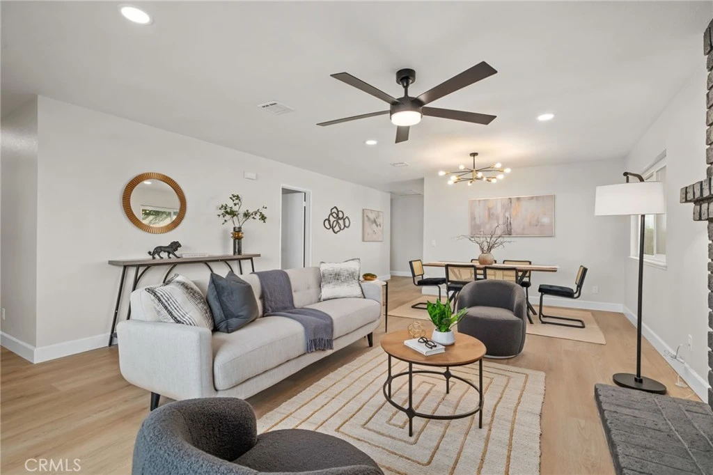 COMPLETELY REMODELED SINGLE-STORY CUL-DE-SAC HOME WITH 27 PAID OFF SOLAR PANELS - This single-story residence features 4 bedrooms and 2 bathrooms on a large pie-shaped lot at the end of a cul-de-sac with mature landscaping. The home includes 27 paid-off solar panels, a newer AC and furnace, and a whole-house fan. The open floor plan is finished with New luxury vinyl plank flooring, New baseboards, New recessed lights, and New interior and exterior paint. The kitchen features New wood shaker soft-close cabinets and quartz countertops. Both bathrooms include New vanities and New tile. All rooms have New ceiling fans and dual-pane windows. The oversized primary suite includes a walk-in closet and a private patio. The layout includes a sunroom and a large wrap-around patio, with one bedroom opening directly to the sunroom, perfect for a home office or playroom. Conveniently located near the 60 and 71 freeways, Ontario Airport, and walking distance to shopping and schools. Come, See This Home Before It's TOO Late!