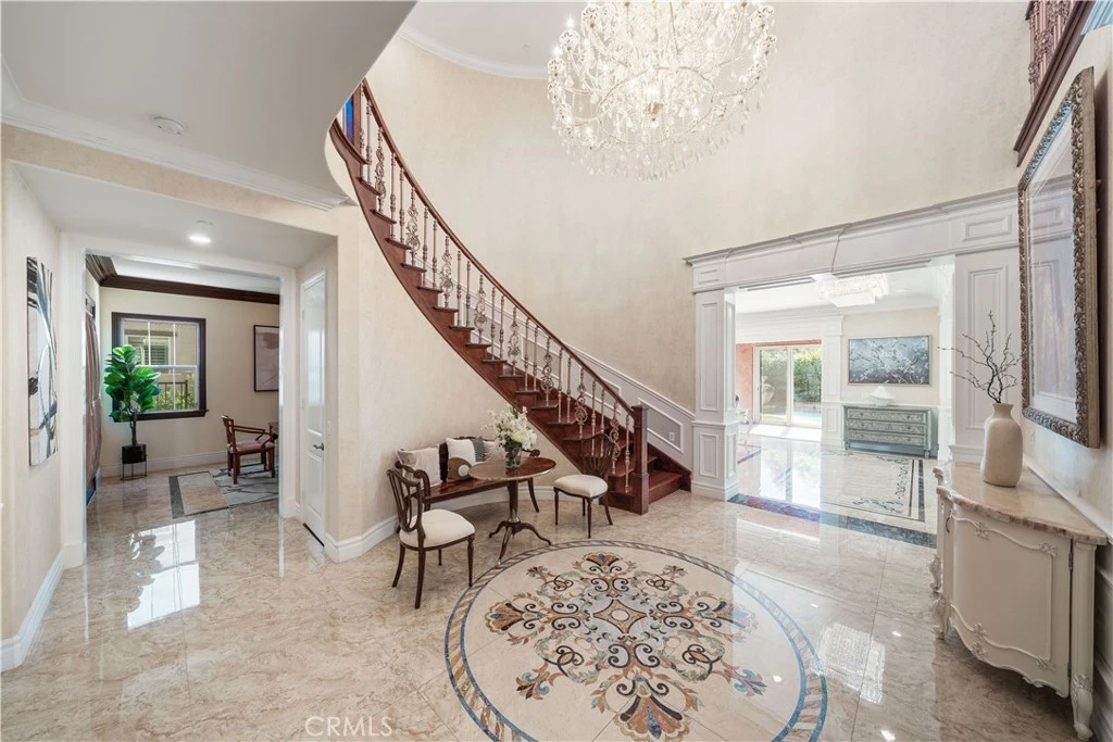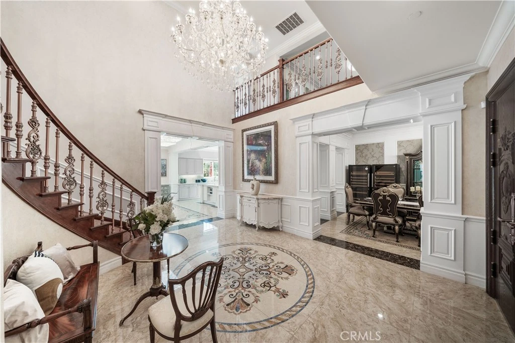 This is a truly rare, custom-crafted luxury home with high-spec upgrades far beyond builder standards. In materials, design, and execution, it stands out as a benchmark for the entire neighborhood. Enter through imported double iron doors to soaring ceilings, a sweeping staircase with custom iron railings, and crystal chandeliers, all sourced internationally. The main level features dual kitchens: a spacious main kitchen and an upgraded High-heat kitchen, perfect for controlling cooking aromas. Beyond the fully permitted covered courtyard and California room, you gain valuable extra living space. On the first floor, enjoy a refined Asian-inspired study and a private suite with its own entrance and bath. Upstairs, you’ll find a serene Japanese tatami-style guest room and a spacious loft. Both the fully paid solar panels and whole-house water softener ensure long-term savings. With top-tier upgrades and a one-of-a-kind flow from entrance to loft, this home is both a functional masterpiece and a unique sanctuary.