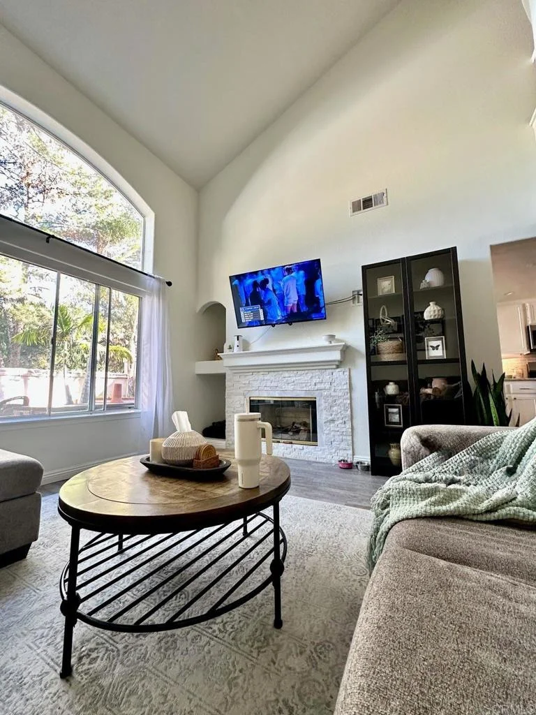 Welcome to this beautifully upgraded and meticulously maintained two-story, townhome located in a friendly, family-oriented neighborhood. The main living area immediately impresses with soaring 12.75-foot ceilings and large bay windows that flood the space with natural light, creating a bright, open, and grand atmosphere. A white stone fireplace with elegant gold accents serves as a stunning focal point in the living room, perfect for cozy evenings or entertaining guests. The kitchen features beautiful granite countertops and a versatile mobile island that adds extra prep space, storage, and flexibility for cooking or hosting. A separate dining area provides a dedicated space for meals and gatherings and includes a dimming light switch to create the perfect lighting for both everyday dining and entertaining. A convenient half bath is located on the first floor. Step outside to your private backyard retreat, where palm trees and mature pine trees beyond the yard create a peaceful, oasis-like setting. The yard includes a partial turf area for low-maintenance outdoor living along with a built-in watering system to sustain the surrounding trees and landscaping—perfect for relaxing, entertaining. Upstairs, you’ll find an open loft space ideal for a second living room, playroom, or home office. The open layout allows the natural light from the downstairs bay windows to pour into the upper level. The spacious primary suite offers a private balcony, a walk-in closet, double mirrored closet doors, dual-sink vanity, full shower, and bathtub. The two mirrored guest bedrooms provide comfortable space for family or guests and share a full guest bathroom with a large vanity. Additional features include a electric vehicle charging hookup, washer and dryer, central A/C, a Smart thermostat compatible with Google and Alexa, and white walls throughout, enhancing the bright and airy feel of the home. This extremely well cared for and maintained home is located right on the border of Otay Ranch and Eastlake, and offers easy access to some of the area’s best shopping centers, dining, and everyday conveniences. The community features multiple resident-only pools and parks, making it an ideal setting for families and those who enjoy an active neighborhood lifestyle. Don't miss your opportunity to enjoy a perfect balance of comfort, functionality, and peaceful outdoor living in a welcoming neighborhood—an ideal place to call home.