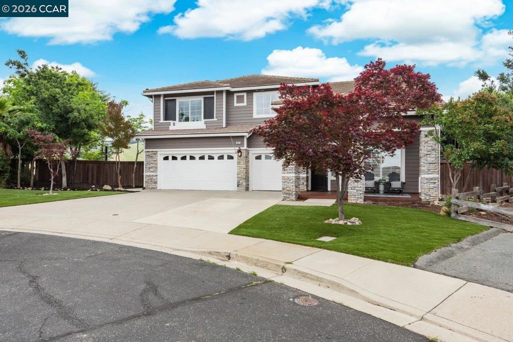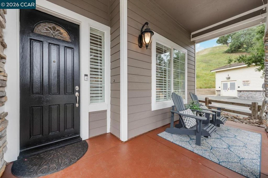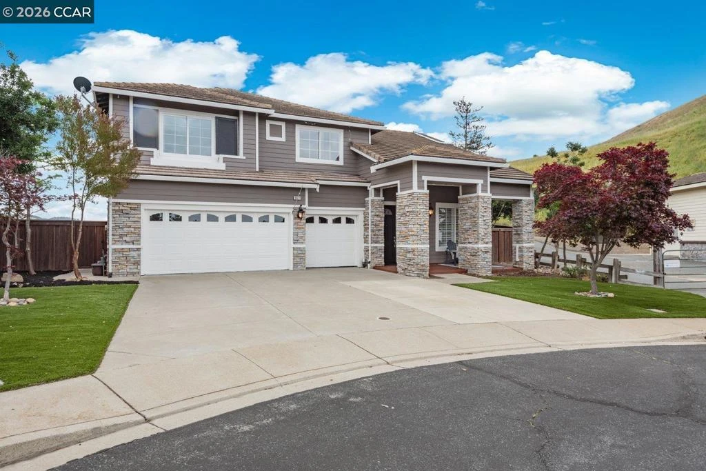Welcome to 9013 Elk Drive in Clayton, a beautifully maintained 4-bedroom, 3-bathroom home offering 2,879 sq ft of comfortable living space, ideally situated on a quiet cul-de-sac. Step into a light-filled formal living and dining room featuring soaring ceilings, multiple windows, plantation shutters, and elegant vinyl plank flooring. The thoughtfully designed kitchen offers a breakfast bar, modern appliances including a recently upgraded dishwasher, stovetop, and Advantium oven, a generously sized pantry, and space for casual dining. French doors provide direct access to the backyard, while the adjoining family room features a striking fireplace and abundant windows, creating a warm and welcoming gathering space. The main level includes a bedroom and full bathroom, along with a convenient laundry room, offering flexibility for guests or multigenerational living. Upstairs, a versatile loft provides additional living, office, or flex space. The spacious primary suite serves as a private retreat, complete with a walk-in closet and beautiful hillside and Mt. Diablo views, with windows on two walls and a sliding door leading to a large private Trex deck. The en-suite bathroom features a soaking tub, double vanities, a large walk-in shower, and additional closet storage. Two secondary bedrooms share a well-appointed hall bathroom with double vanities and a tub. The backyard is designed for both entertaining and everyday enjoyment, featuring a large-paved patio area with an expansive covered structure spanning the back of the home, creating multiple shaded spaces for dining and lounging. Enjoy private hillside views, a sparkling pool (currently chlorine with option for saltwater), and a spa. An outdoor built-in barbecue with bar seating serves as a central gathering point, complemented by a small basketball court and low-maintenance landscaping with artificial turf and drought-tolerant plants. Recent upgrades include interior and exterior paint, remodeled bathrooms, updated HVAC, upstairs carpet, fencing, outdoor lighting, and fully owned solar. The pool system has also been fully updated, including sweep, heater, pump, lighting, tank, and filters. Enjoy the perfect balance of outdoor adventure and modern convenience, with nearby walking trails and a variety of shops and restaurants just a short drive away. With its serenity, sense of privacy and generous living space, this home offers an exceptional place to call home. Views: Ridge