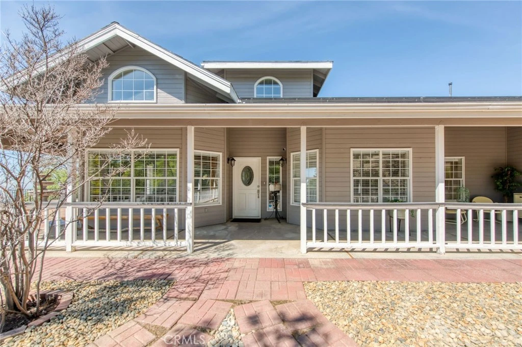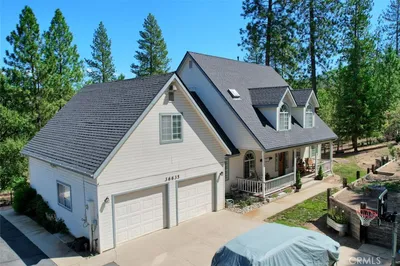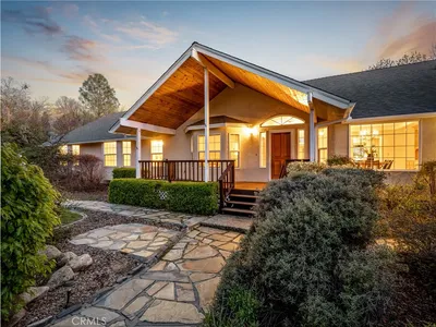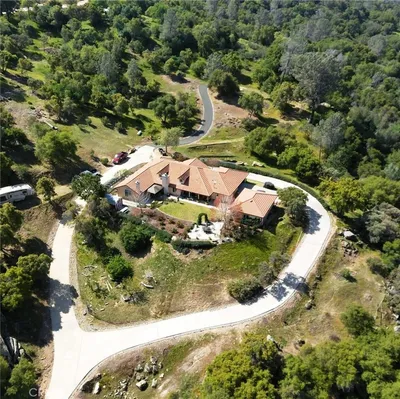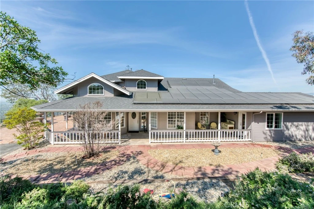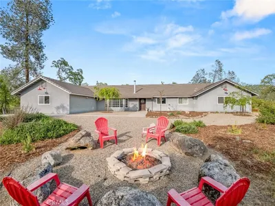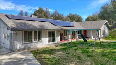 Elevate your lifestyle in this custom-built architectural masterpiece, a rare 5-bedroom / 2.5 bathroom executive estate with OWNED/PAID-OFF SOLAR on a sprawling 5.34-acre lot. Designed for those who demand both sophistication and serenity, this home captures breathtaking panoramic views of the Sierra Nevada Mountains and Valley floor from every window. Whether you're a professional seeking a quiet sanctuary or a family that loves to host, this property delivers. Bring your horse—the community has stables. Step inside to an expansive open-concept chef’s kitchen with premium stainless steel appliances and two adjoining formal dining areas, creating seamless flow for entertaining. Soaring ceilings and rich hardwood floors lead into a stately room, perfect as a formal dining space or library. The primary suite is a true sanctuary with a spacious spa-like bathroom. A standout feature is the fully independent upstairs guest wing with private 2-bed, 1-bath quarters—ideal for multi-generational living, guests, or an au pair. Downstairs offers a perfect work-from-home suite with private entrance, bedroom, and two flex rooms for office, gym, or business use. Outside, a detached knotty pine studio is ideal for creative space or playhouse, plus a custom-built Tuffshed workshop with workbench and overhead storage. Outdoor living shines with a 1,000-square-foot Mediterranean tiled terrace with coastal range views, and a wrap-around porch offering privacy. Additional features include a large utility room, three walk-in closets, detached two-car garage, and enclosed carport. With a newer roof (2014), updated HVAC (2012), and a fully paid-off Generac whole-house generator, this home blends beauty with reliability. Located in Yosemite Lakes Park, enjoy HOA amenities including golf, equestrian center, pool, tennis courts, trails, saloon, and restaurant for $178/month.