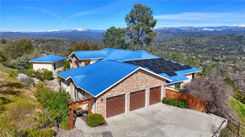 Single-story custom home on over 5 private acres offering panoramic, unobstructed 180-degree mountain and sunrise views. Built in 2015, this 3,986 sq ft residence features 5 bedrooms and 4 bathrooms, including a separate furnished guest house with bath (included in count), along with two large, dedicated office spaces ideal for remote work or multi-generational living. The home is filled with expansive windows in every room, bringing in abundant natural light and capturing scenic views throughout. The main living area showcases dramatic 16-foot floorto-ceiling windows framing the surrounding landscape and an impressive gas fireplace. Spacious eat-in kitchen includes granite countertops, abundant cabinetry, and a large walk-in pantry. The primary suite offers a spa-like en suite bath with steam shower, soaking tub, dual vanities, and a generous walk-in closet. A second primary suite includes its own en suite bath and walkin closet. Neutral finishes throughout make the home move-in ready. A gently winding private driveway approximately one-tenth of a mile from the main road leads to the home, enhancing privacy and creating a quiet, secluded setting. Notable features include metal roof, fire-resistant siding, fire sprinklers, fire-rated windows, and owned solar. Additional amenities include a private gated entry, three-car garage with separate workshop waterfall fountain at the entry, and low-maintenance natural landscaping with drip irrigation. Property is ideally situated above the fog and below the snow, offering privacy, scenic beauty, and comfortable year-round living.
