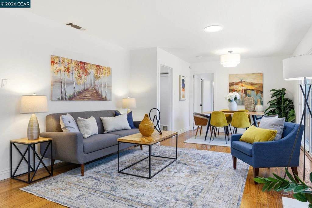 Single-story 3-bedroom, 2-bath home on a large, flat lot in Diablo Estates with bright, connected living spaces & an expansive backyard framed by mature trees. The main living area centers around a fireplace & opens to the yard through two sliding glass doors from the living & dining areas, creating a seamless indoor-outdoor connection. Hardwood flooring extends through the main living areas & bedrooms, with natural light enhanced by sun tunnels & large windows. The dining area connects to the kitchen, which features shaker-style cabinetry, stainless steel appliances & a gas cooktop. The primary suite is set on one side of the home with its own slider to the backyard & an ensuite bath. Two additional bedrooms are located on the opposite side near a remodeled hall bath, creating separation from the primary suite. The backyard is the standout, with a wide, open layout shaded by mature trees. A deck with built-in bench seating anchors the space, with room for recreation, gardening or future additions. The garage adds functionality with finished flooring, laundry cabinetry & a utility sink. Walkable to El Monte Elementary & just one block from Concord Community Park, with easy access to the Contra Costa Canal Trail, BART, shopping, dining & major commute routes.