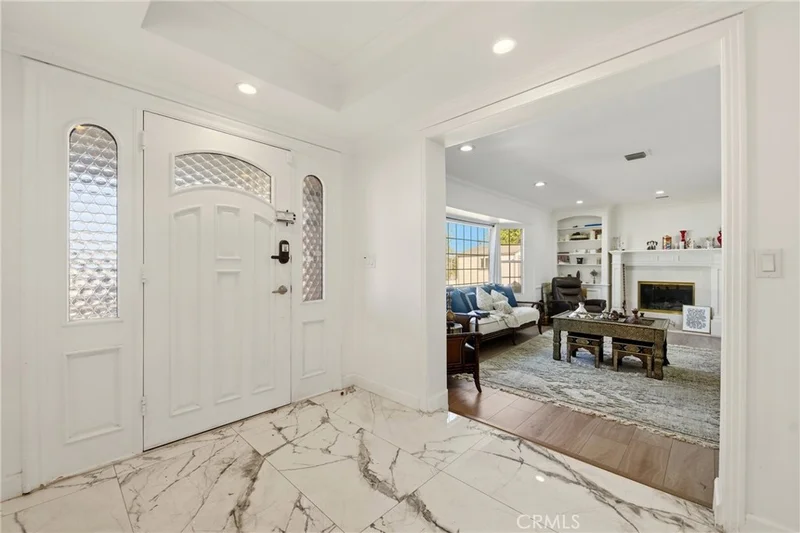 Welcome to 1301 Paseo Grande in Corona, a well-appointed home designed for everyday comfort and easy entertaining. The property offers multiple spacious living areas with abundant natural light, including a formal living room with fireplace and coffered ceilings, and a separate family room with exposed beams, a second fireplace, and sliding doors that open to the backyard. A dedicated office or den with custom built-ins provides flexibility and may be used as a fifth bedroom, complete with a private full bathroom and separate exterior access. Upstairs features four bedrooms, including two primary-style suites for flexible living arrangements. The main primary suite offers plantation shutters, space for a sitting area, a walk-in closet with built-ins, and an ensuite bath with soaking tub and glass-enclosed shower. A separate laundry and utility room with extensive cabinetry adds convenience. The updated kitchen includes white cabinetry, stone countertops, a waterfall-edge island, and a professional-style range with hood and full-height backsplash, opening to the dining area for everyday living and gatherings. The low-maintenance backyard is designed for water-efficient living with extensive concrete hardscape, a covered patio with ceiling fans, an in-ground pool, and an elevated gazebo or pavilion area suitable for gatherings. Additional features include mature landscaping and solar panels.