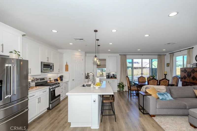 Welcome to your dream home in the guard-gated community of Skyview at Terramor. (Built 2024), this stunning upgraded single-story residence features fully paid solar and perfectly blends modern design with energy efficiency. This beautiful home offers 3 bedrooms, 2 bathrooms, and an attached two-car garage. The open floor plan seamlessly connects the kitchen, dining, and family rooms, ideal for both everyday living and entertaining. Oversized sliding glass doors frame gorgeous mountain views and fill the home with natural light. The gourmet kitchen showcases a spacious quartz island, top-of-the-line appliances, and elegant finishes. Seller invested significantly in premium builder upgrades. A combination of upgraded laminate flooring and plush carpet runs throughout, while ceiling fans enhance comfort in every room. The primary suite is a tranquil retreat featuring a walk-in shower also showcases quartz countertops and a generous walk-in closet. Additional energy-efficient features include a tankless water heater and Energy Star appliances. Terramor, named Master Planned Community of the Year by the Building Industry Association of Southern California (2018), offers resort-style amenities, more than 540 acres of protected open space, scenic views of Cleveland National Forest, 5 miles of trails, and 22 acres of parks. Conveniently located near the I-15 freeway, Glen Ivy Hot Springs, and shopping and dining at The Shops at Dos Lagos. Don’t miss the opportunity to own an exceptional home in one of Corona’s most desirable communities. Schedule your private showing today before it's too late!
